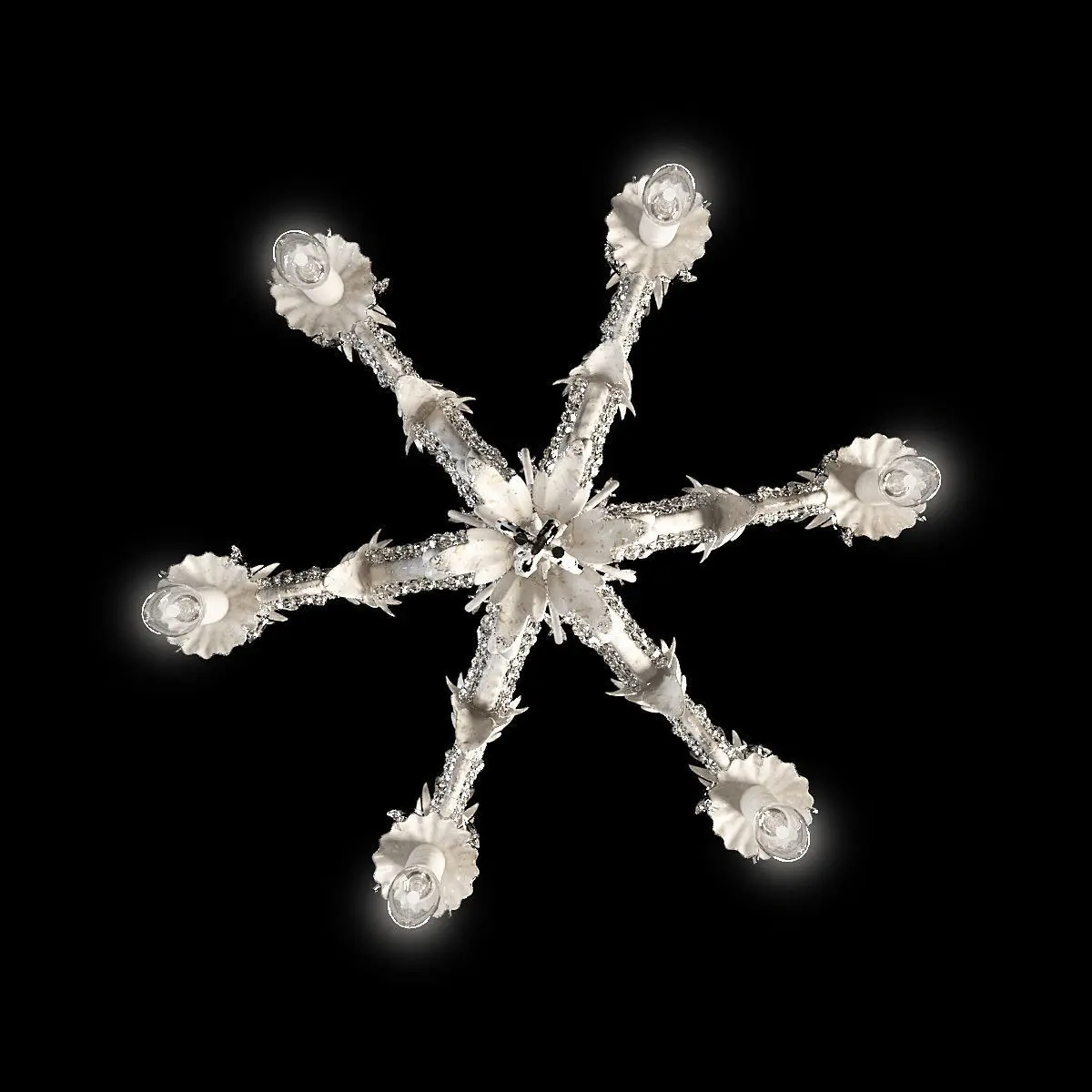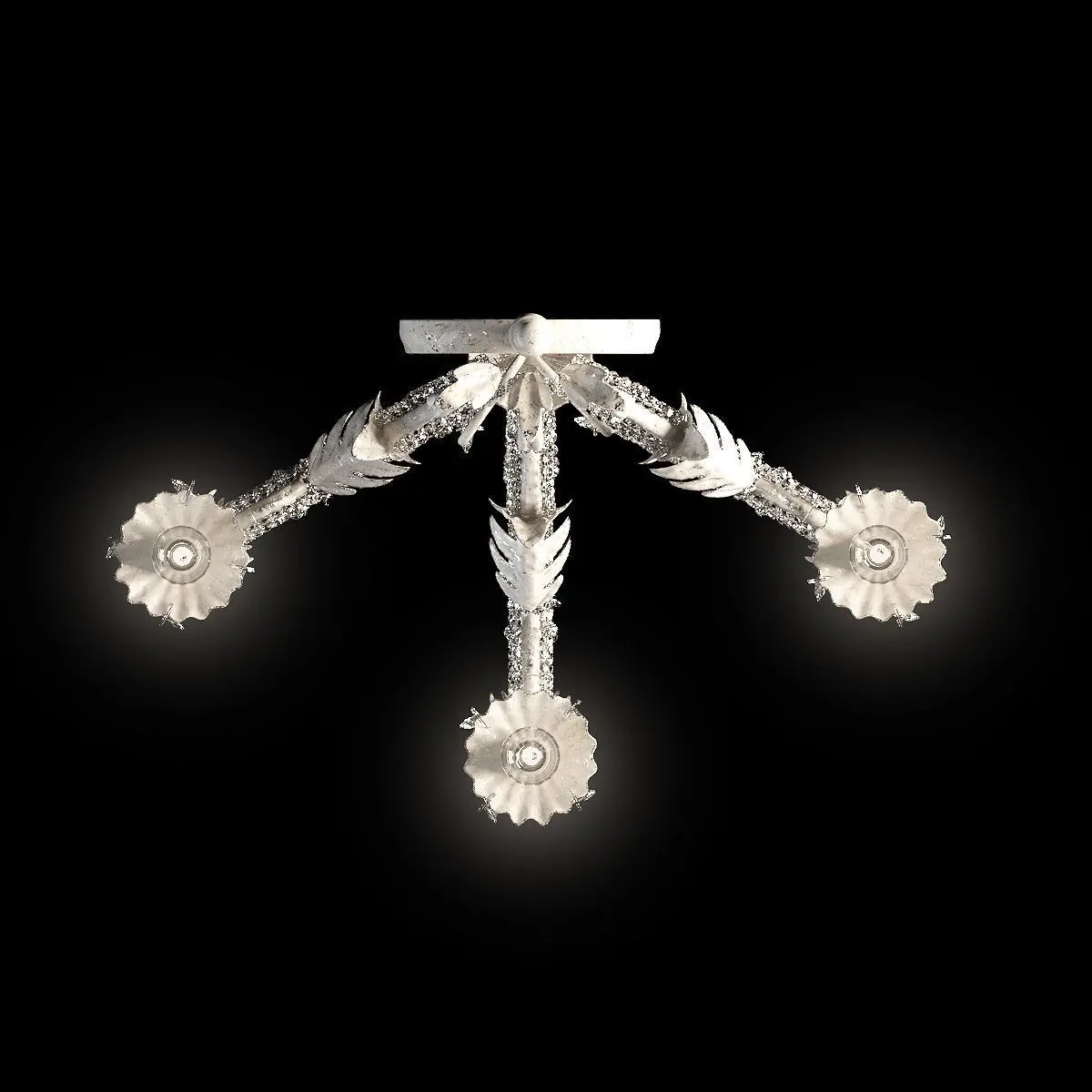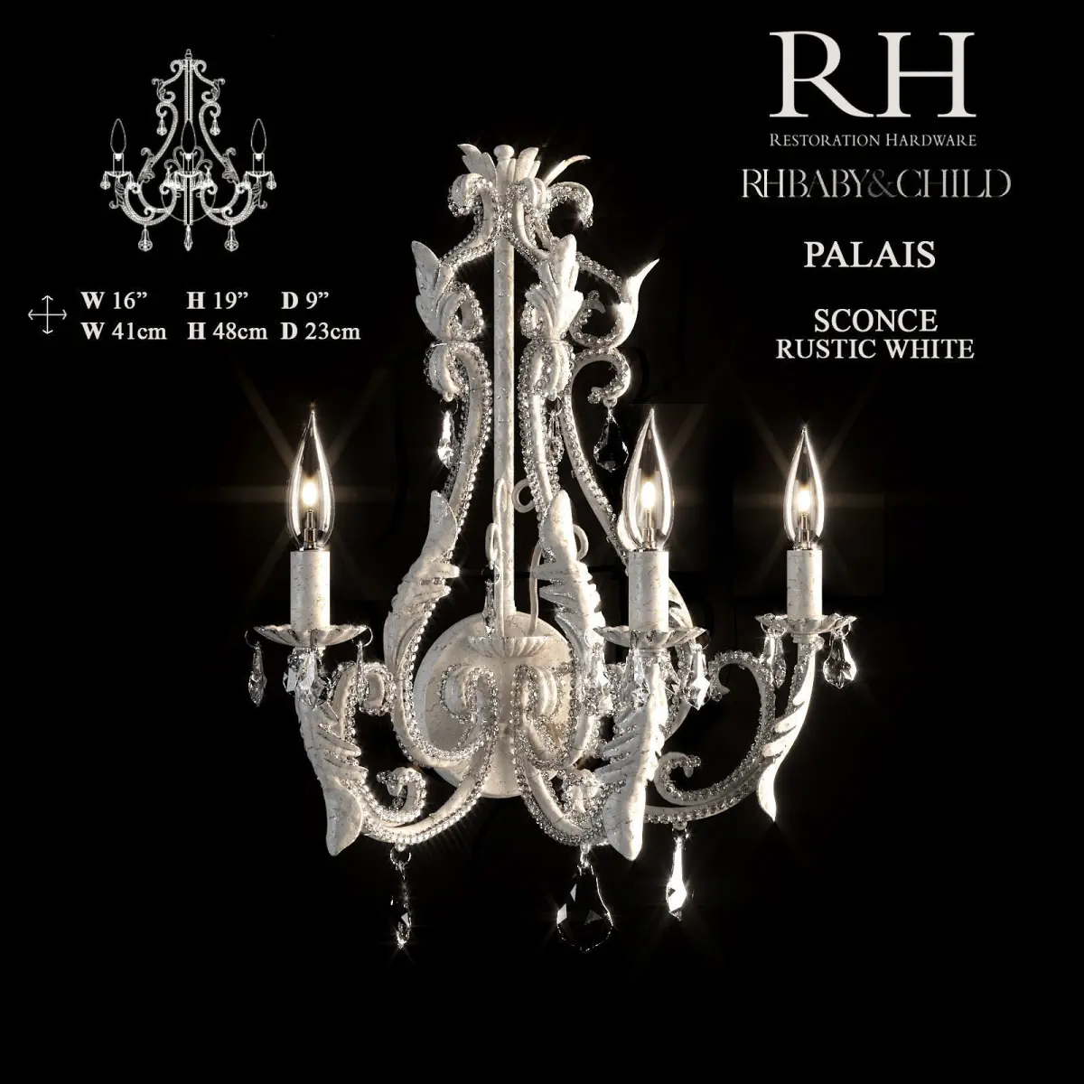 Palais small chandelier and Palais sconce from Restoration Hardware. Crafted of metal with rustic white finish.