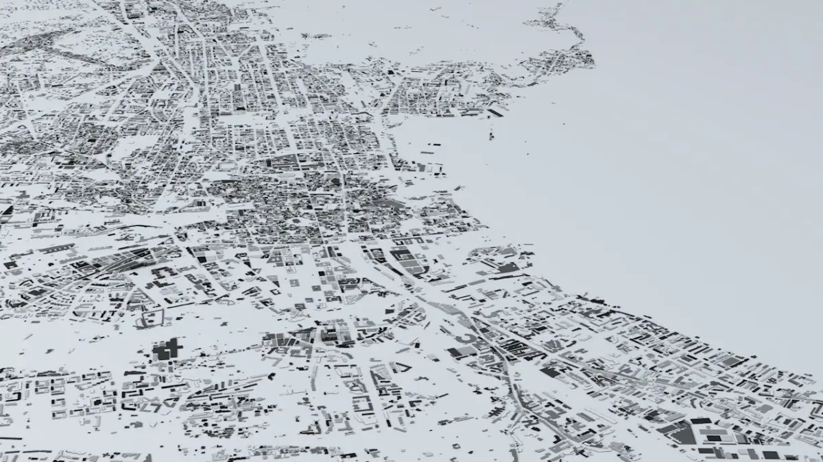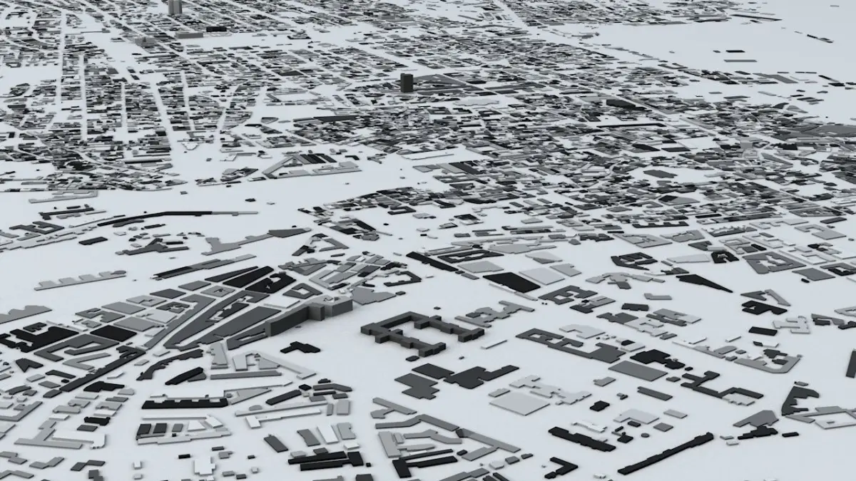 - the model is positioned on a flat surface (all buildings are on the “floor” - no elevation data included)