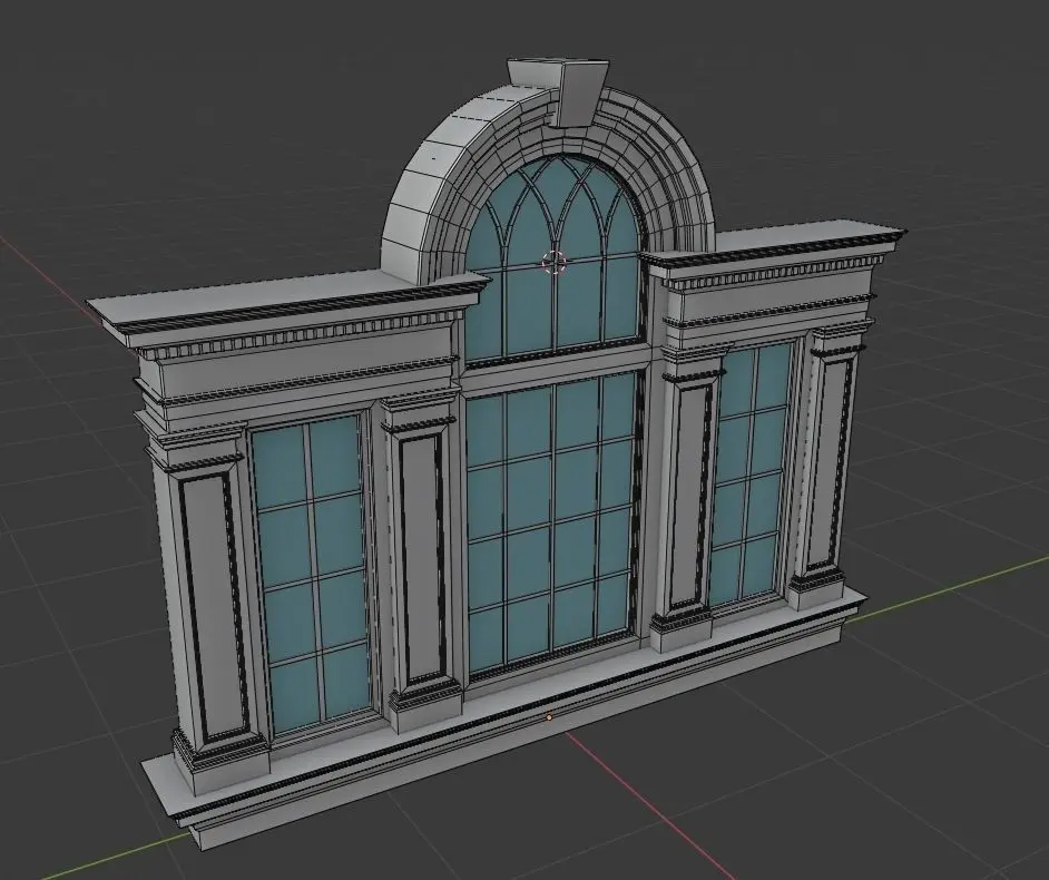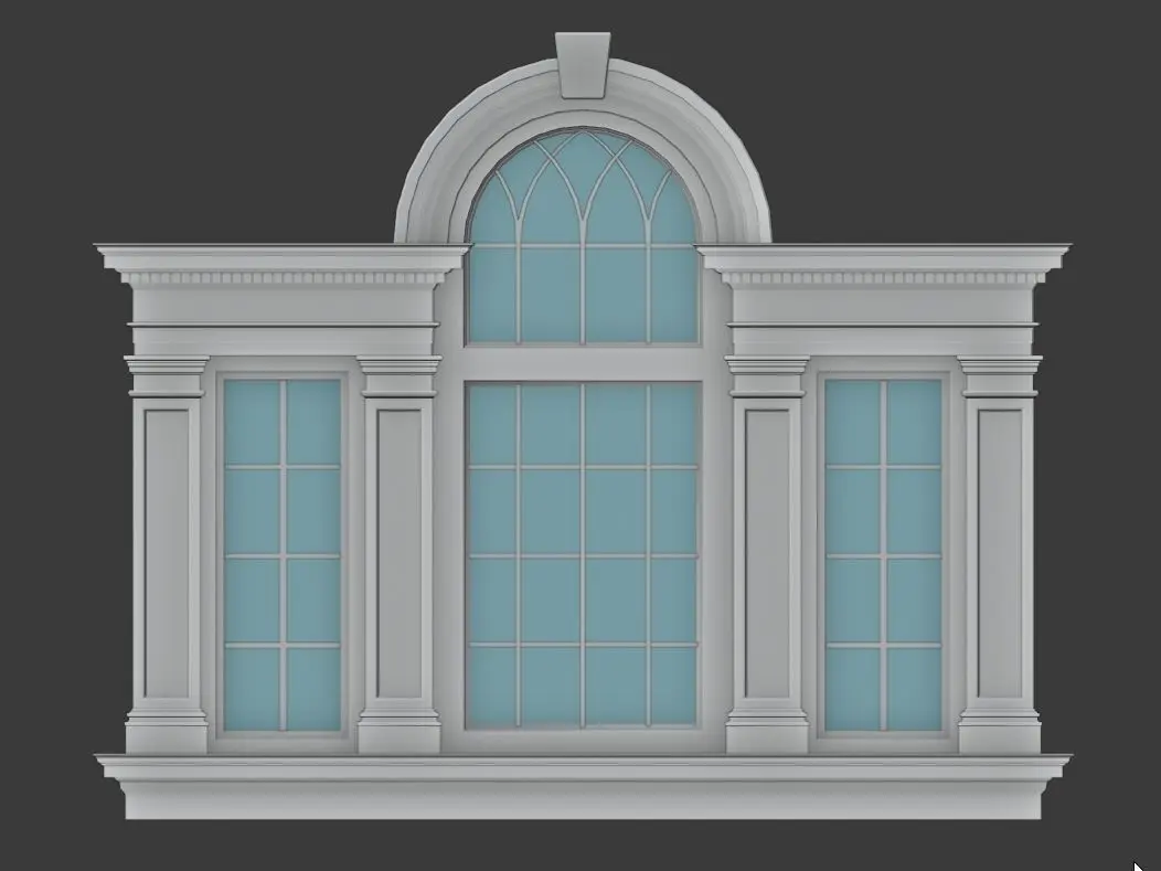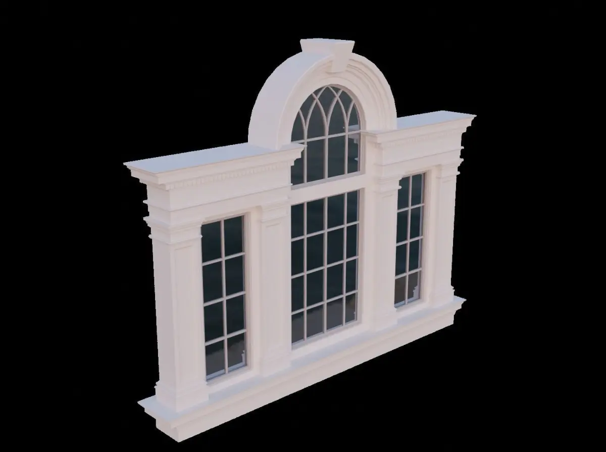 The palladian Window is a grouping of three bays (or triplet) whose central bay is covered with a semicircular arch, the two lateral bays are covered with a lintel (or a flat arch band) at the level of the transom.