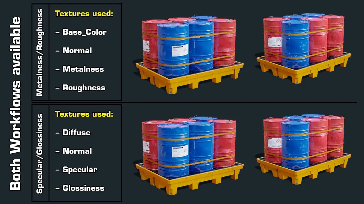 - Both Metallic/Rough and Specular/Gloss PBR workflows are available.