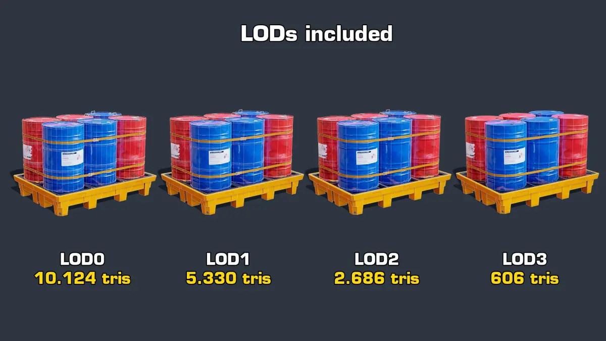 Barrels 3d model consist of 1 object with LODs: