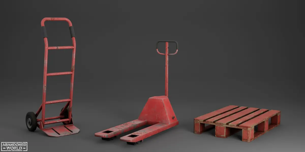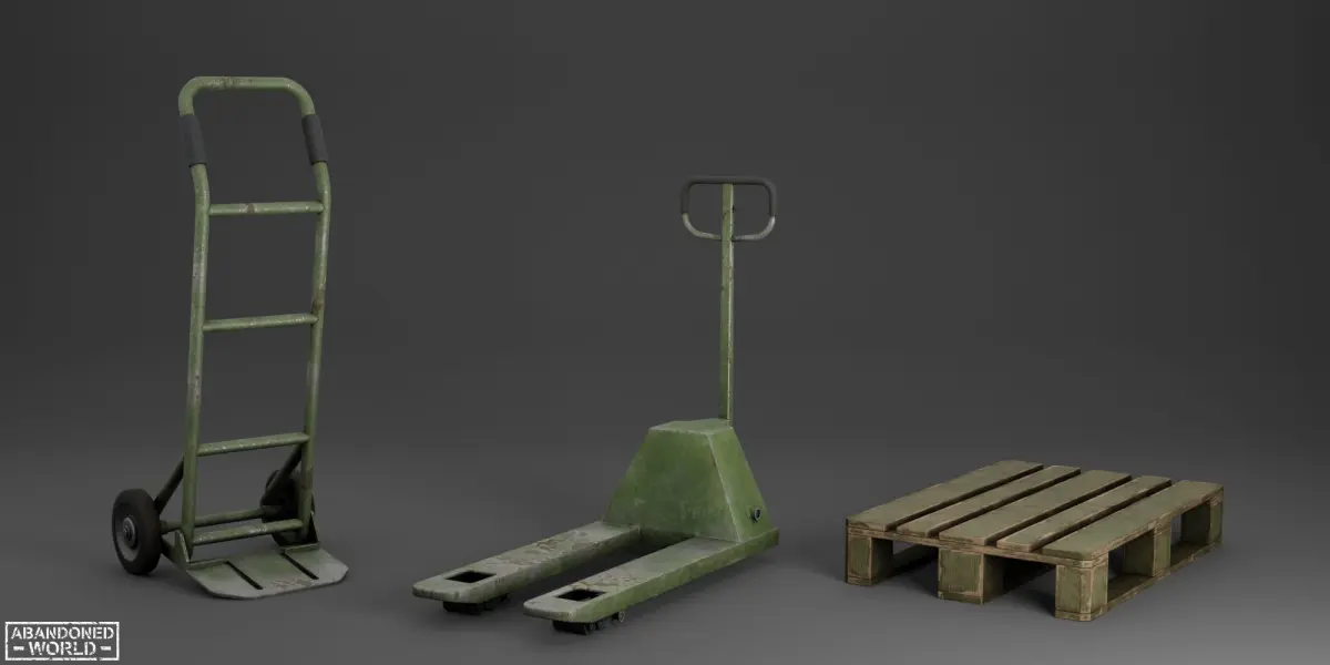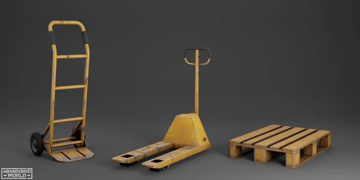 Pallet Jack & Warehouse Equipment made in Game Ready. The pallet jack and the wooden pallets themselves with a trolley are typical attributes of any warehouse premises. Perfect for the Unreal Engine & Unity.