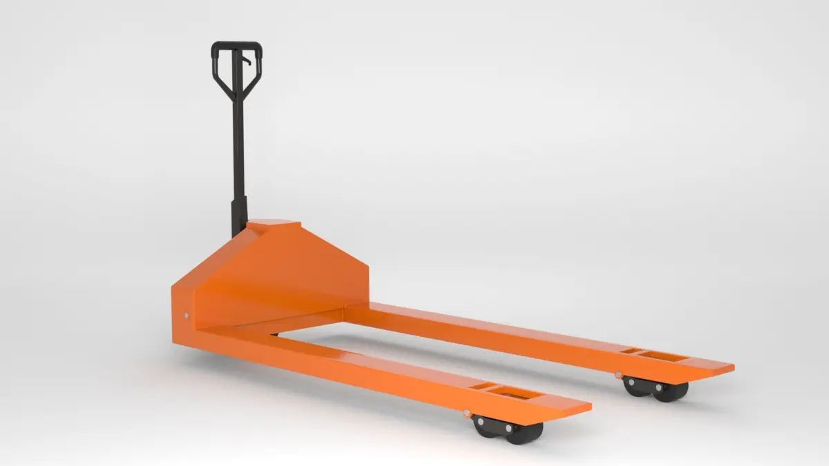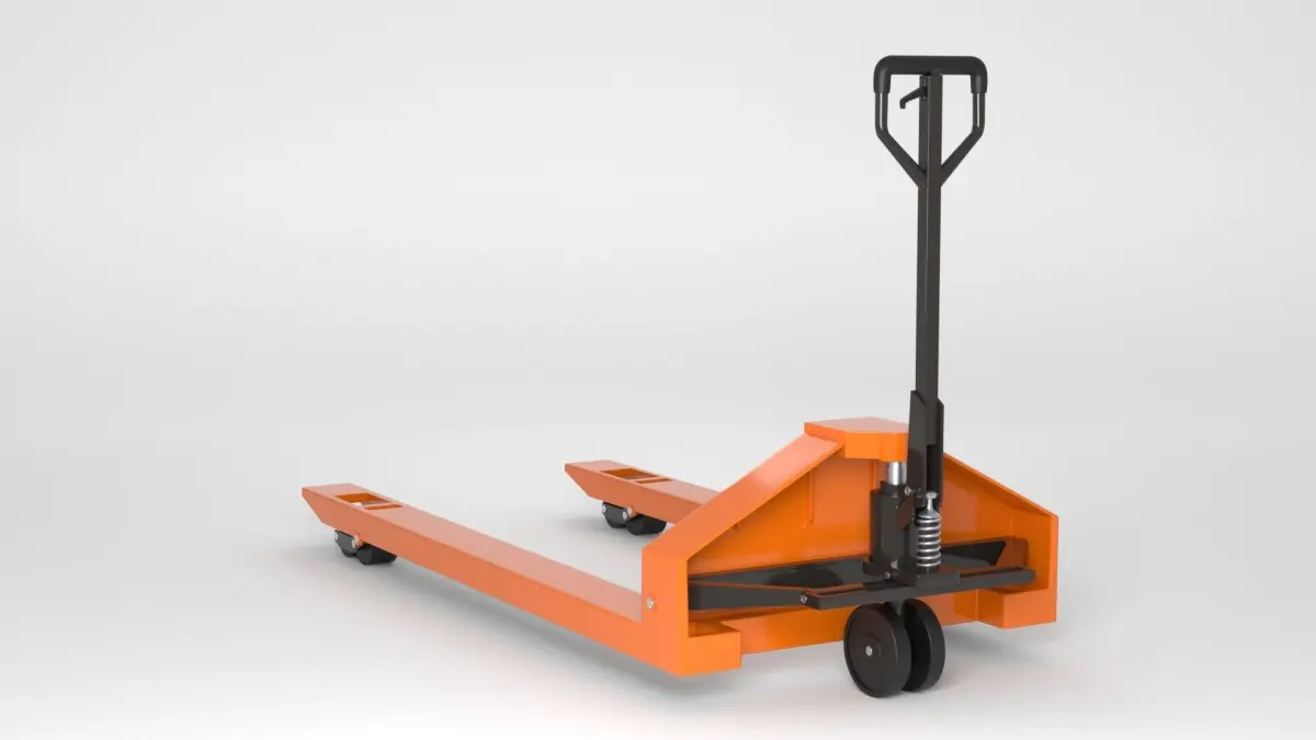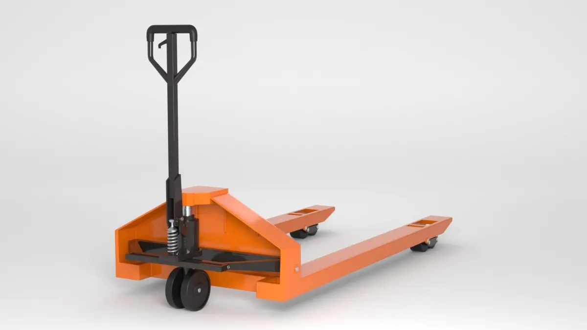 This product is a three-dimensional model of an empty manual, hand operated, hydraulic trolley, which is a portable lifting and transportation device, designed for pallet transportation.