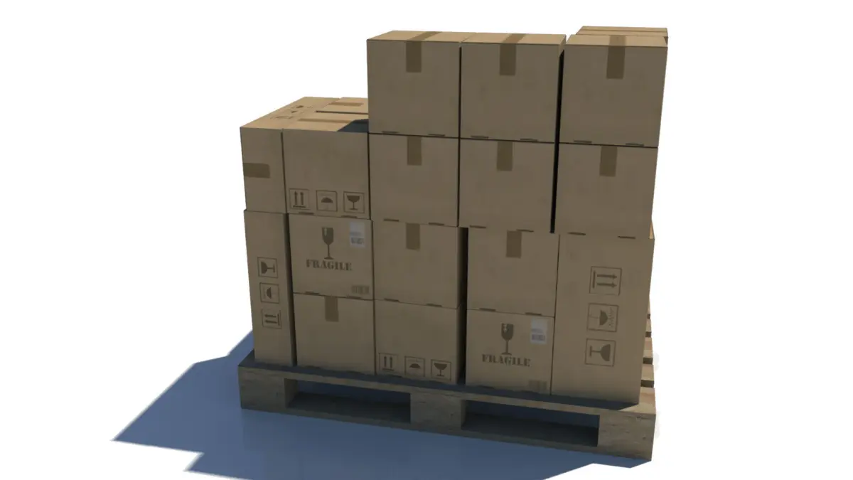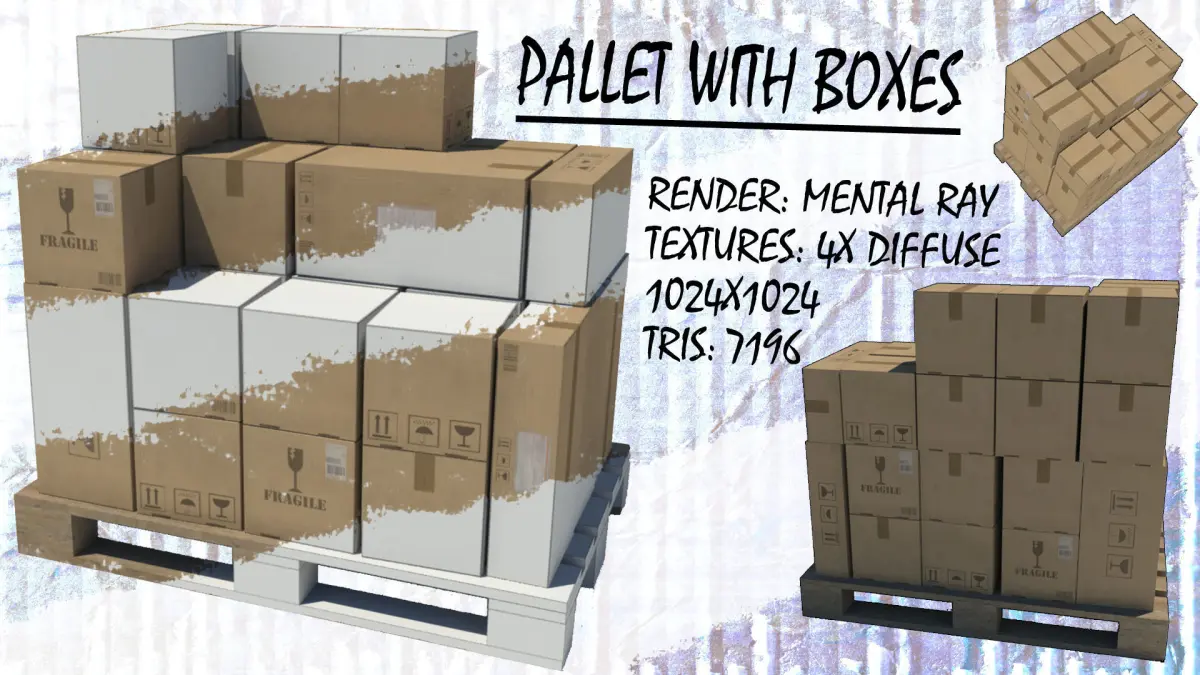 Pallet with boxes:- Poly: 3746- Tris: 7196- Texture: 1024x1024 (4x Diffuse)