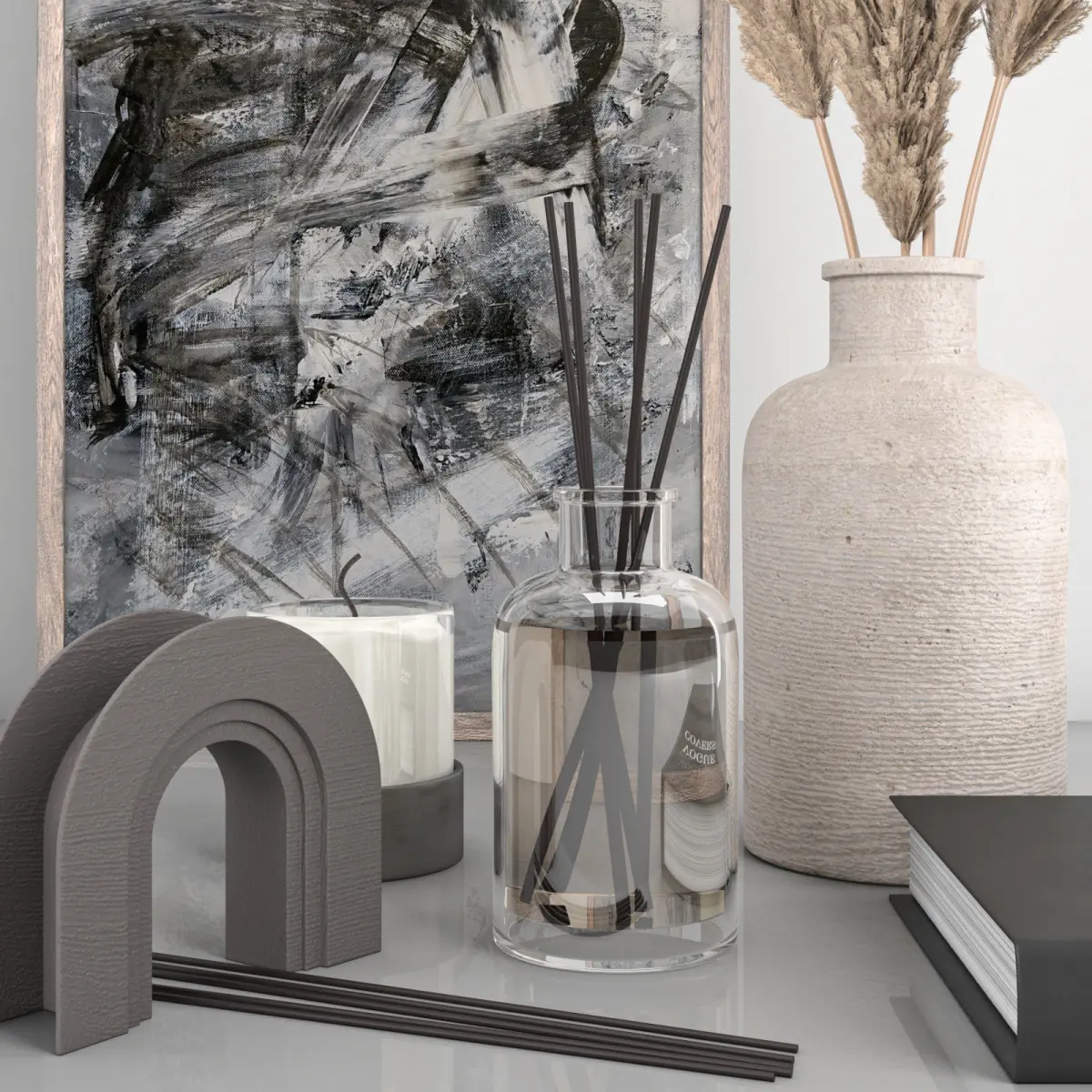 wall decor picture , sculpture and other decorative objects which are candle , diffuser, sticks alarm clock and book