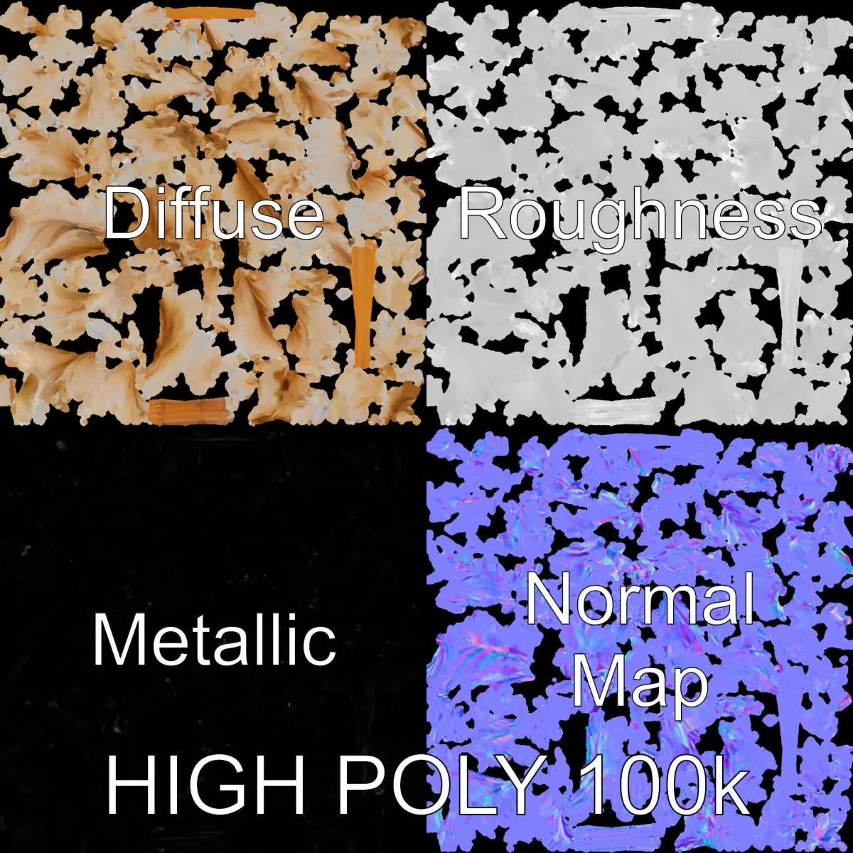 This Pampas Grass Model Pack includes three levels of detail to suit various needs: mobile applications, game environments, and high-definition production rendering. Perfect for enhancing interior design scenes, nature landscapes, or promotional marketing materials. The model uses PBR textures, including Diffuse, NormalMap, and reflection/roughness/metallic maps, ensuring compatibility across modern rendering engines such as 3ds Max, Maya, and Blender. Each model features a detailed and meticulously crafted geometry with no overlapping UVs, offering a realistic look with textures sized at 4096*4096.