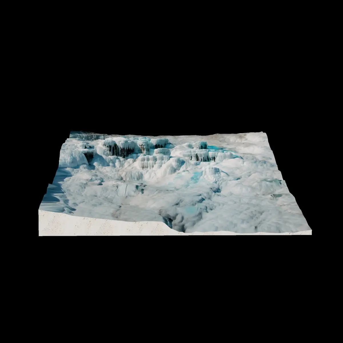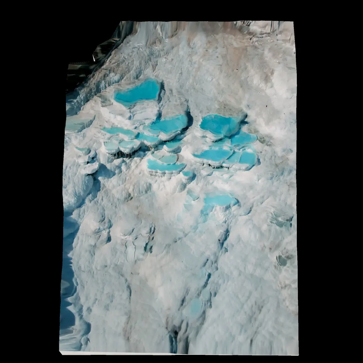 Somewhere deep in the earth beneath Pamukkale and the ancient Roman city of Hierapolis lies a vast source of water heated by volcanic lava. The water dissolves pure white calcium, becomes saturated with it, and carries it to the earth’s surface, where it bursts forth and runs down a steep hillside. Cooling in the open air, the calcium precipitates from the water, adheres to the soil, and forms white calcium “cascades” frozen in stone called travertines or thermal pools. The water has been bursting forth at Pamukkale for more than two millennia. The Romans built the spa city of Hierapolis so citizens could come and enjoy the health benefits of the hot mineral water.
