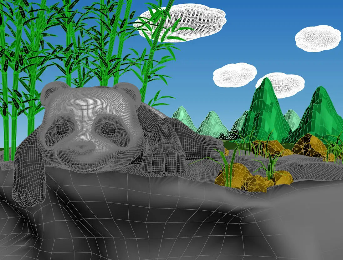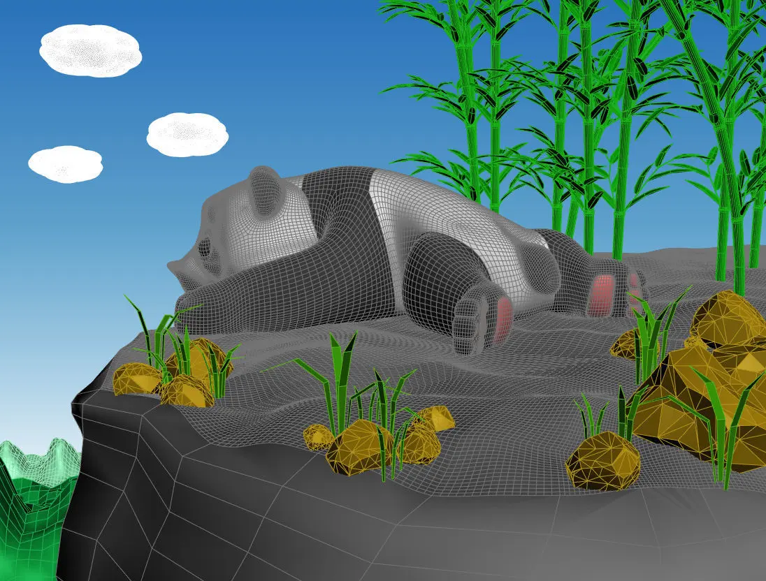 Rock, stones with grass, bamboos, two type of mountains and several clouds, all low poly. Two render scenes done with Vray Toon.3D printed and coloured the panda model looks really nice.