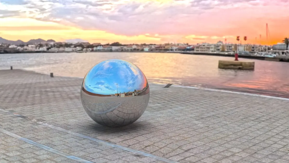 High-resolution equirectangular HDRI (360° panoramic) captured at golden hour along a tranquil marina promenade. This environment features a stunning sky with scattered clouds, soft sunset tones, and a mix of water reflections and clean stone pavement textures. Ideal for 3D visualization, virtual tours, architectural renderings, and lighting environments in CGI and VFX.