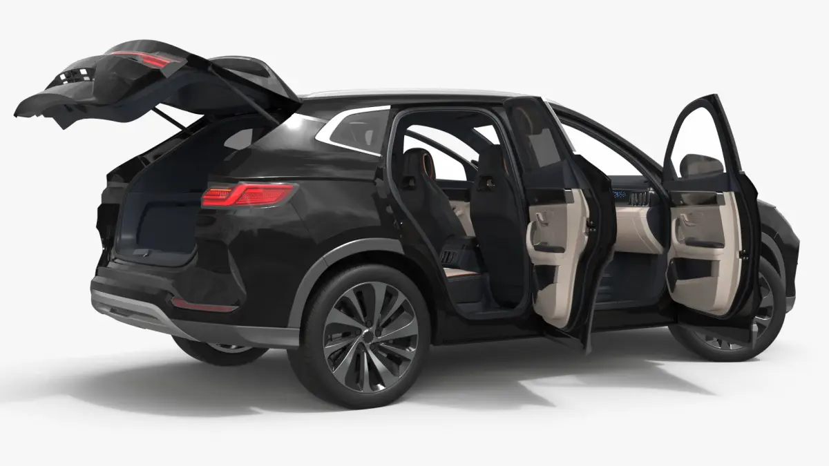 Panoramic Roof Electric SUV Black Rigged for Cinema 4D is a three-dimensional model of modern electrical SUV crossover car, that is a passenger EV designed for family use and urban commuting.