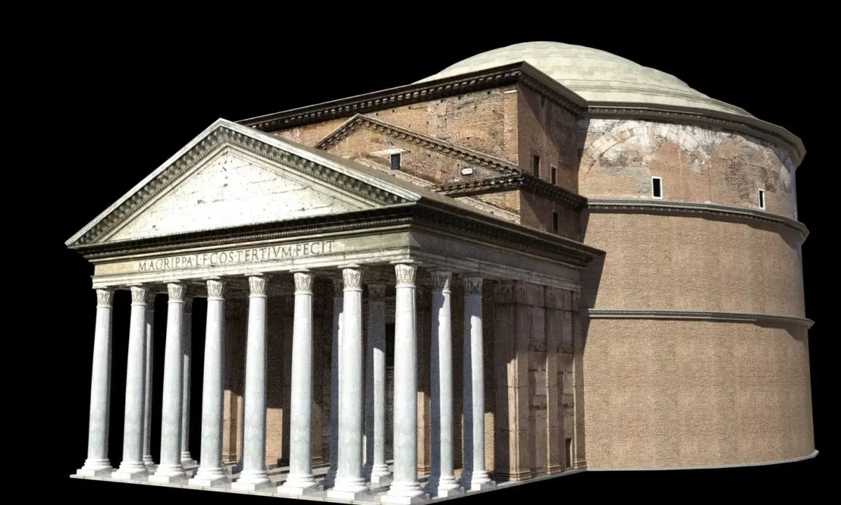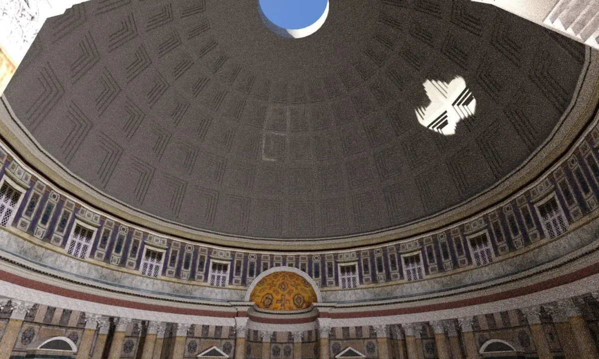 Model of the Pantheon in Rome, a well preserved building dating to the time of the Emperor Hadrian. Originally a temple dedicated to all the gods, it was later converted into a church dedicated to St Mary and the Martyrs, and became the burial place of various notables including Raphael. Model includes interior with coffered dome, and with the upper storey restored to it's original look. (On the actual building only a small section is thus restored). Other than that the model generally goes by the building's current condition, though without the Christian statues and altars within.