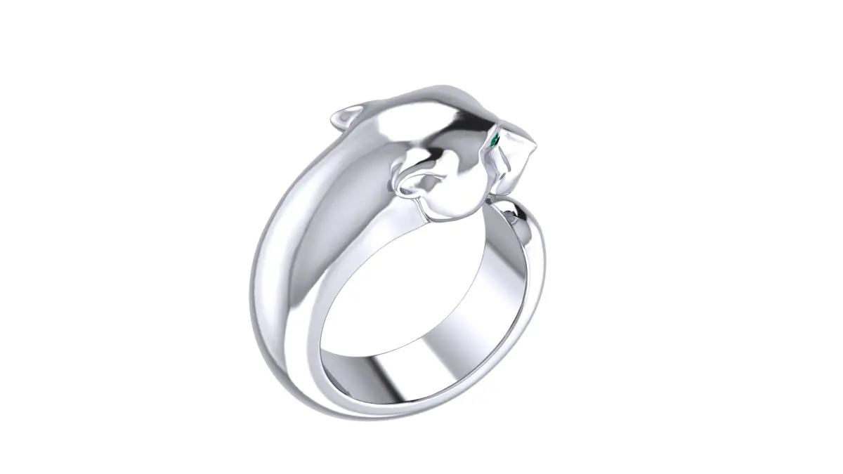 This bold and stylish panther ring features a sleek open-band design with a sculpted panther head, symbolizing power and elegance. Crafted in polished white gold or platinum, the ring showcases intricate detailing, including diamond-accented eyes that add a touch of luxury. It is a perfect statement piece for those who appreciate fierce and sophisticated jewelry.
