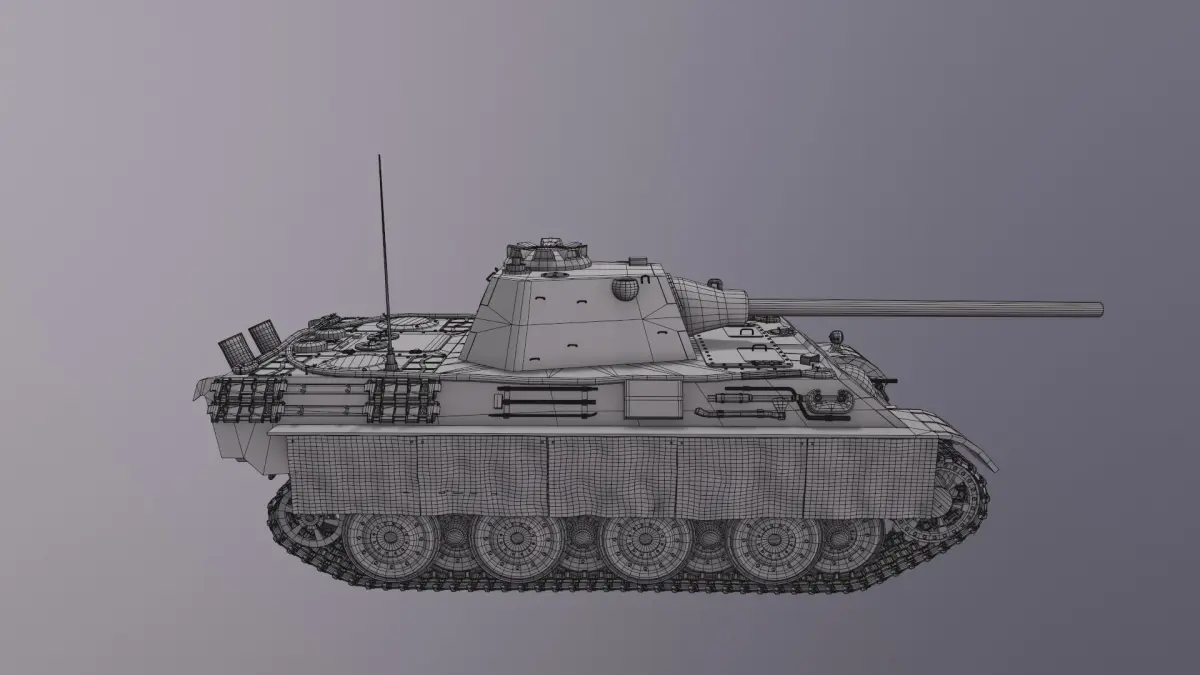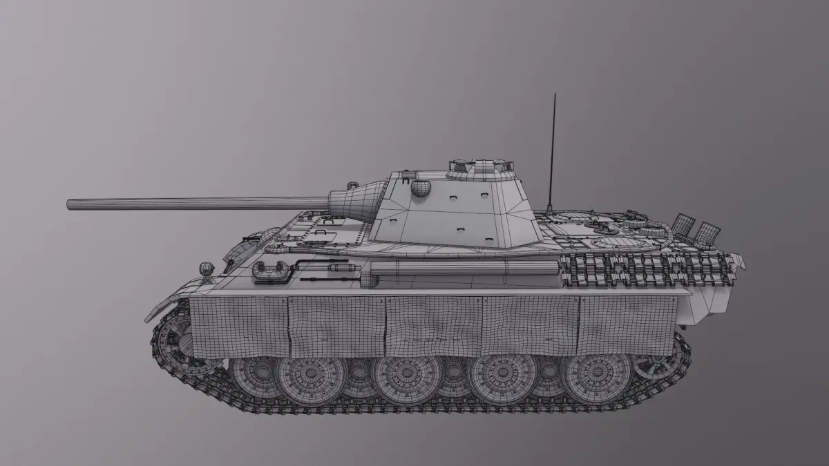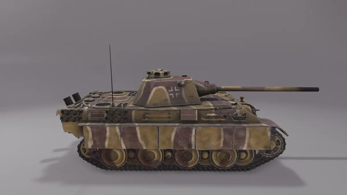This Panther F model was made in Blender, textured in Substance Painter. Most of the outside details were done. Turret and main armament can be rotated and elevated/lowered respectively. Pivot points are not located in the coordinates (x0, y0, z0), so the origins for main armamemt and turret rotation axis are not being reset. There is no opportunity to open hatches. No parent links between objects were made. There are seven collections for each texture set in the scene.