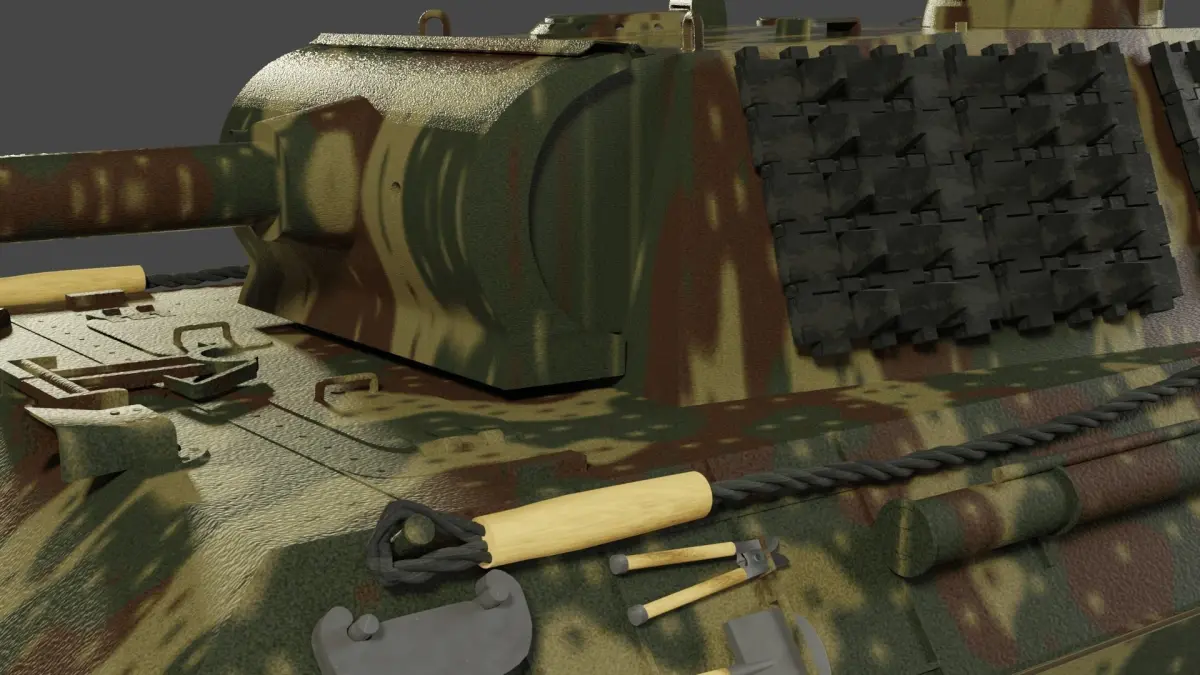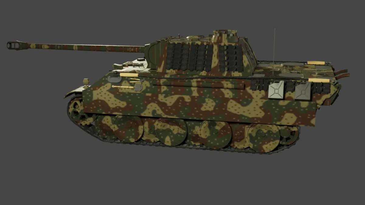 This is my Panzer V Panther model. It were done in Blender . I tried to use historical camouflage and instruments colors. This model is very detailed with elements like: canister ,ropes,hammer,small bolts etc. Also the surface of corpus, tank's turret and other elements has relief and scratches. I hope you like version of Panther. If you have some questions about model, price etc , dont shy go write me, i am always here.P.S: Also i will put some sreenshots with out colors.