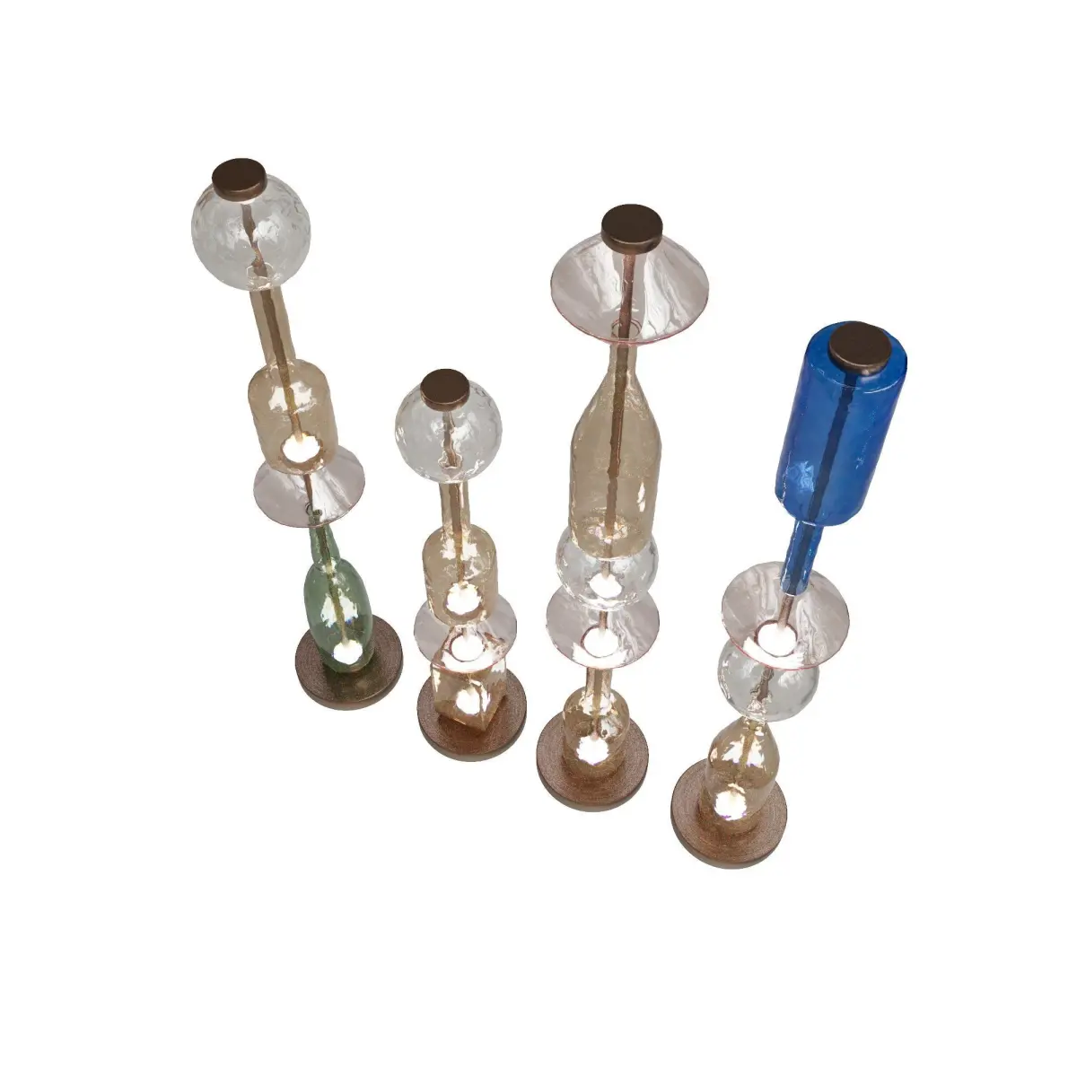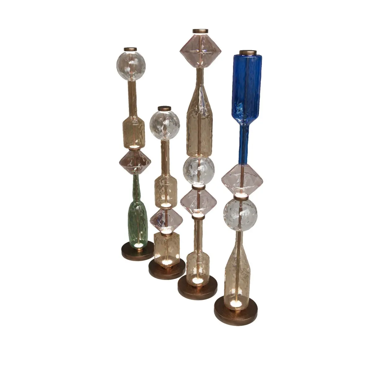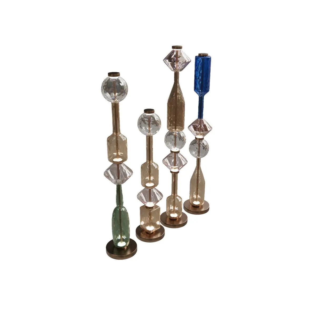 Totem-like floor lamps, uniquely crafted using the traditional Murano blown glass technique. Luminous Icons comprise four models capable of radiating their own light, each defined by a metal structure with a matte gold finish, adorned by a combination of four glass elements stacked one above the other, distinguished by various geometries and colours. A lively, intense, and luminous proposition, capable of bringing an unexpected chromatic energy to indoor spaces.