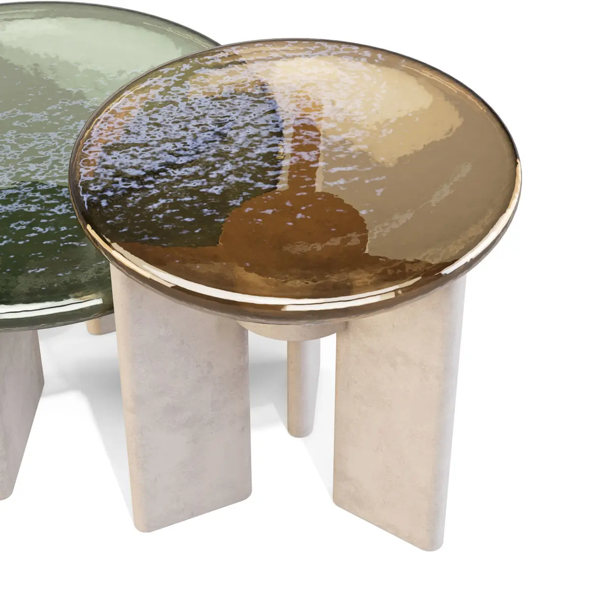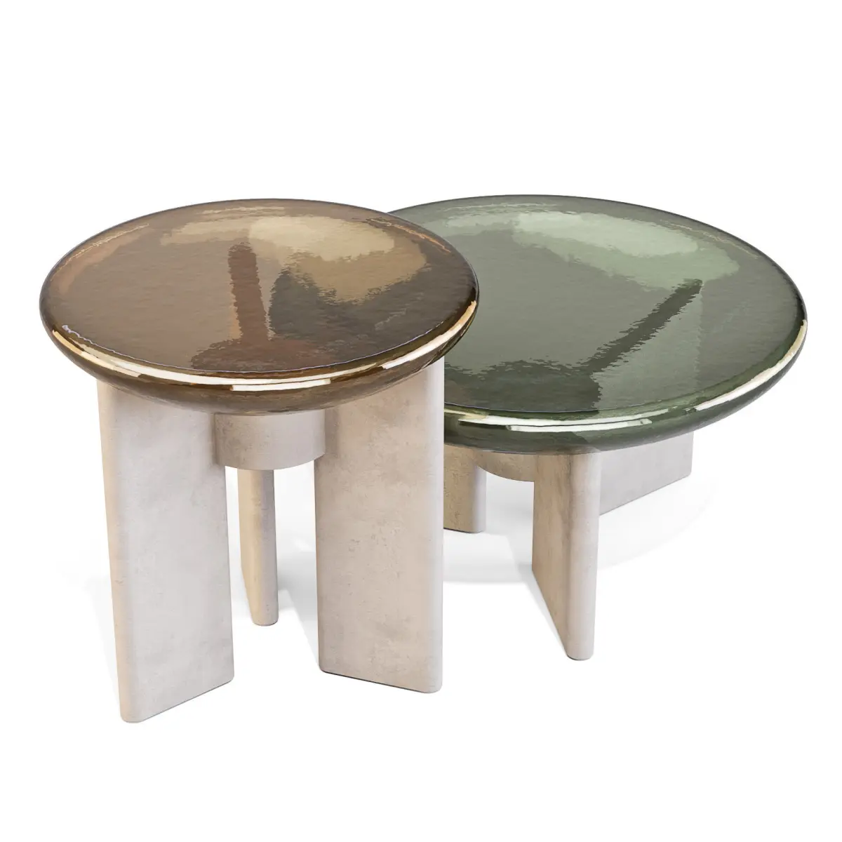 - Coffee tables with base in Vicenza stone honed col. Ivory composed by three vertical slabs fixed to a central disc. Top made of mouth-blown Murano glass, with an internal wavy effect that embellishes the object. A convex undertop allows the embedment of the glass top inside the base housing.
