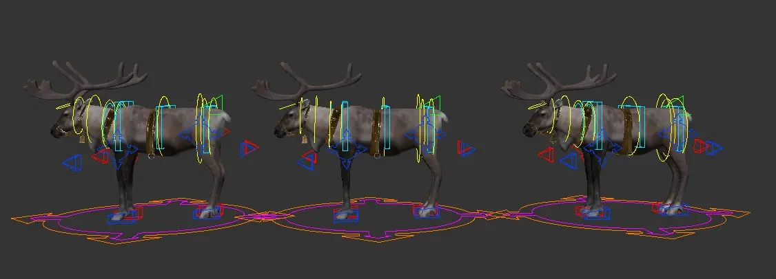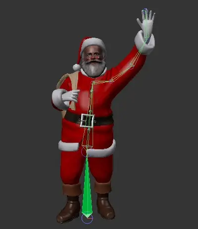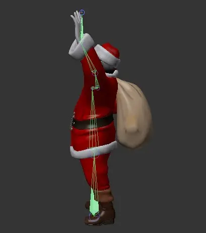 as cordas tem Joints para seguir um sistema de Constrain em Parentes, que respeita as distancias e é facil de animar.as Renas tem controladores completos, podendo animar obtendo Cmotion nas funções do Character, Ative em objeto> Objeto Properties>Walk>"mude o (Static) para (LINE).O papai noel só tem 20% do rigging que faz com que só mova o braço esquerdo.