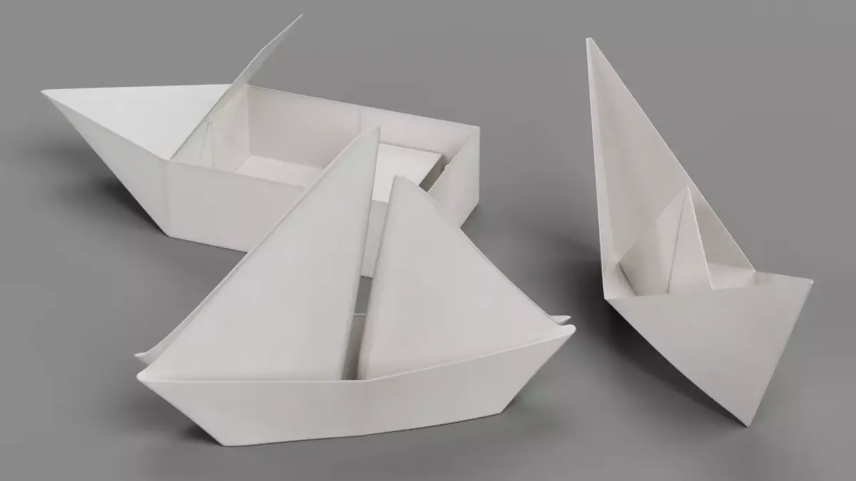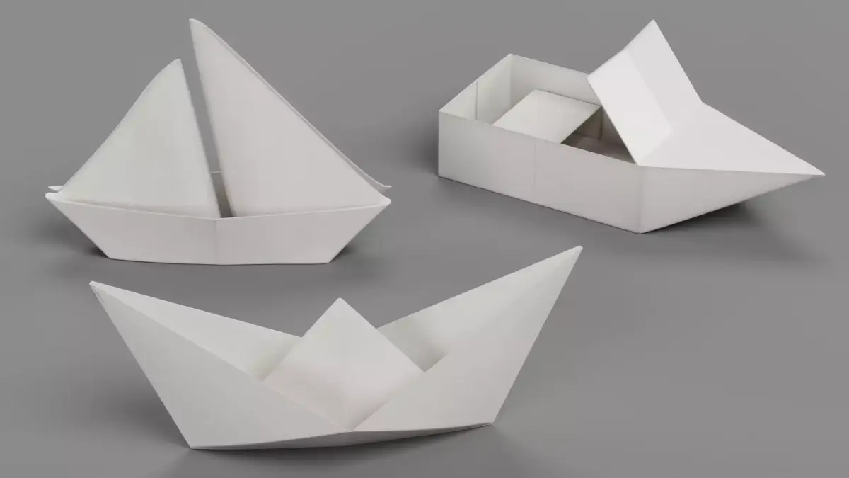 A stylized set of three white paper boats, capturing the folded paper geometry, edges, and subtle surface variations. The minimalistic design emphasizes the simplicity and delicate structure of real folded paper.