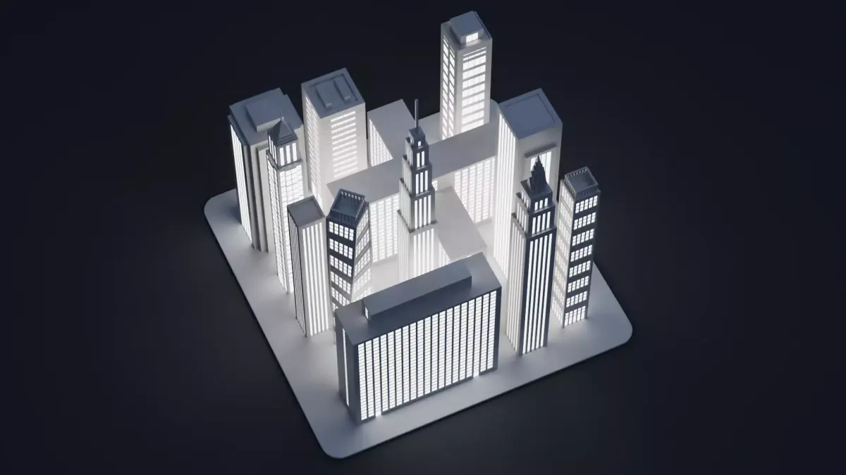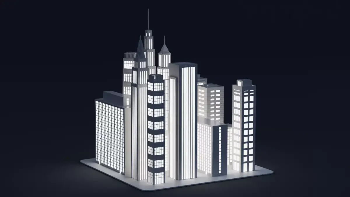 - Complete city block made of stylized paper skyscrapers