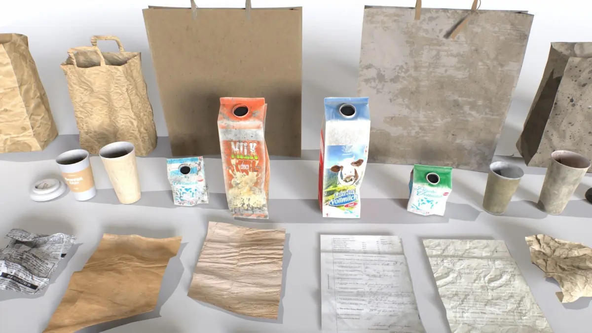 Pack of paper junk . Realistic scale. Includes bags, vases, docs and milk boxes. 15 meshes.