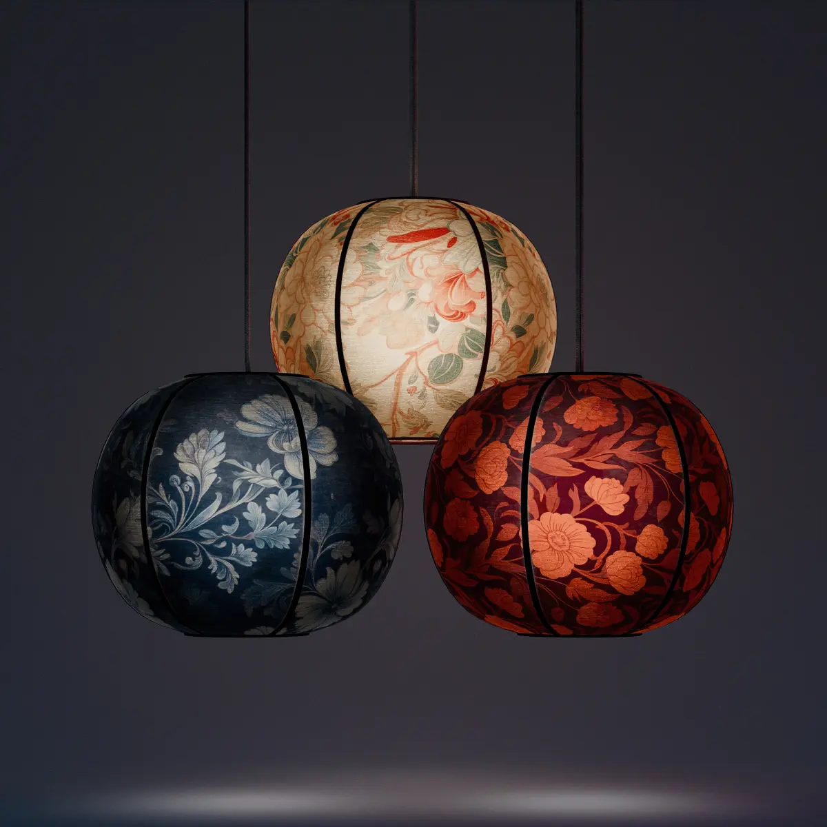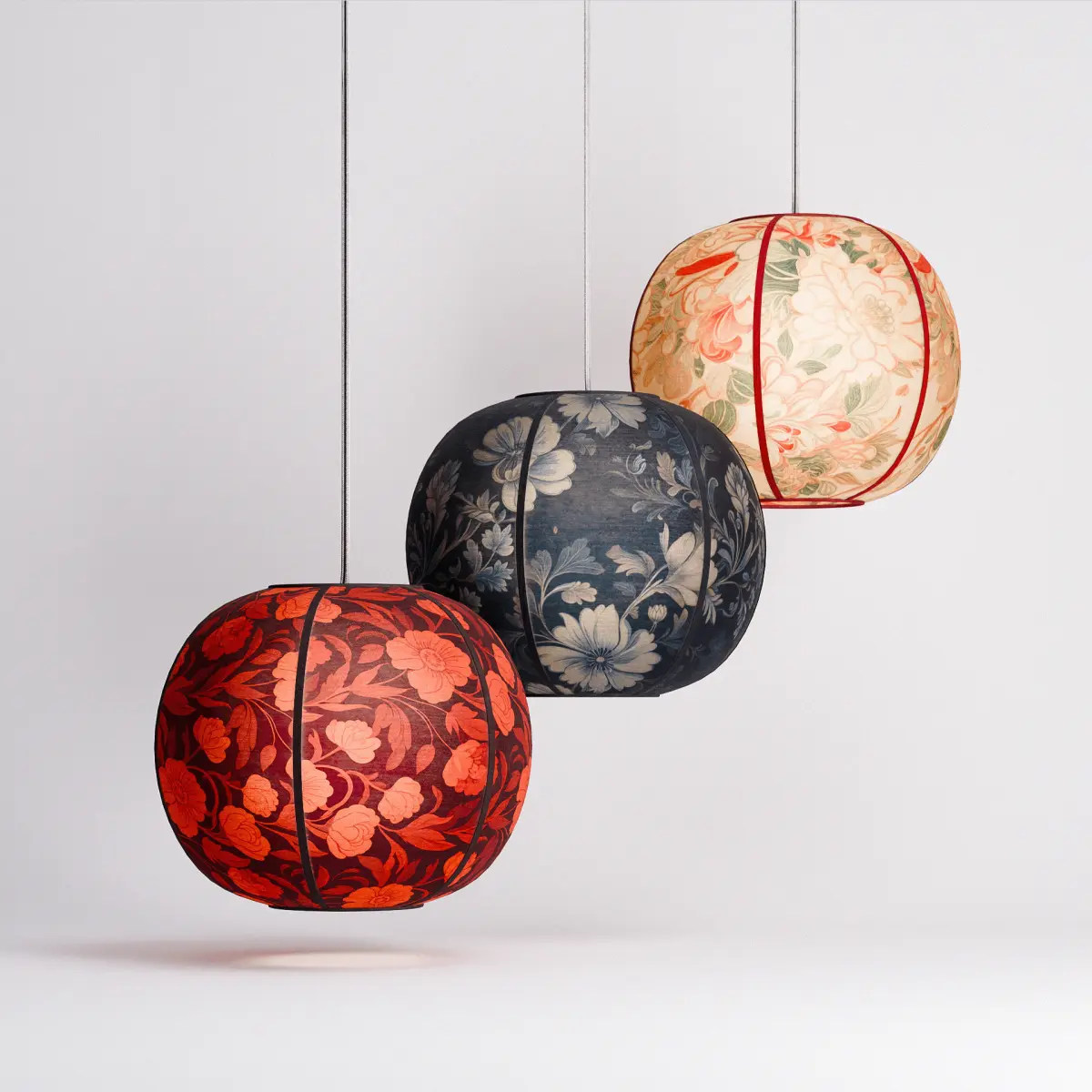 Paper Lantern Set 01 features a trio of spherical hanging lanterns, each adorned with vintage-inspired floral patterns in rich navy, deep crimson, and soft ivory tones. The delicate paper texture is paired with gently worn fabric ribs and subtle translucency, allowing for realistic light diffusion in both daytime and lit scenes. Crafted with high-resolution PBR materials, the set captures the tactile essence of hand-painted lanterns and offers natural color variation and fine detail. Ideal for atmospheric interior renders, festive setups, or stylized decor scenes, these lanterns infuse any 3D composition with warmth, charm, and a touch of cultural elegance.