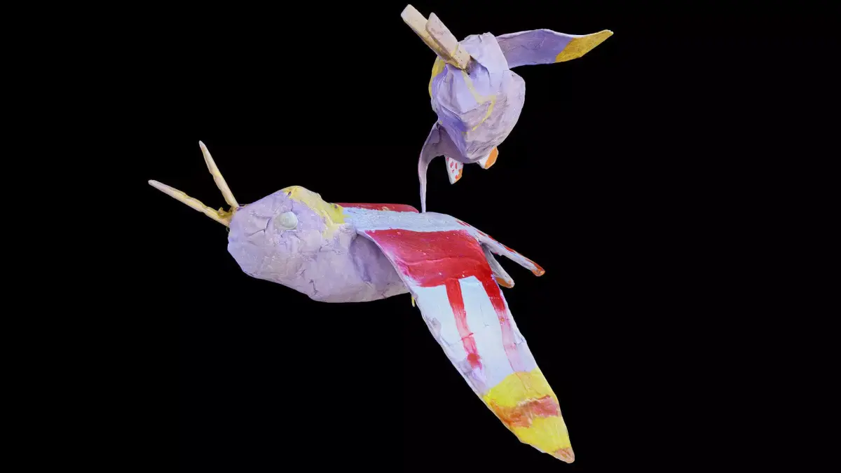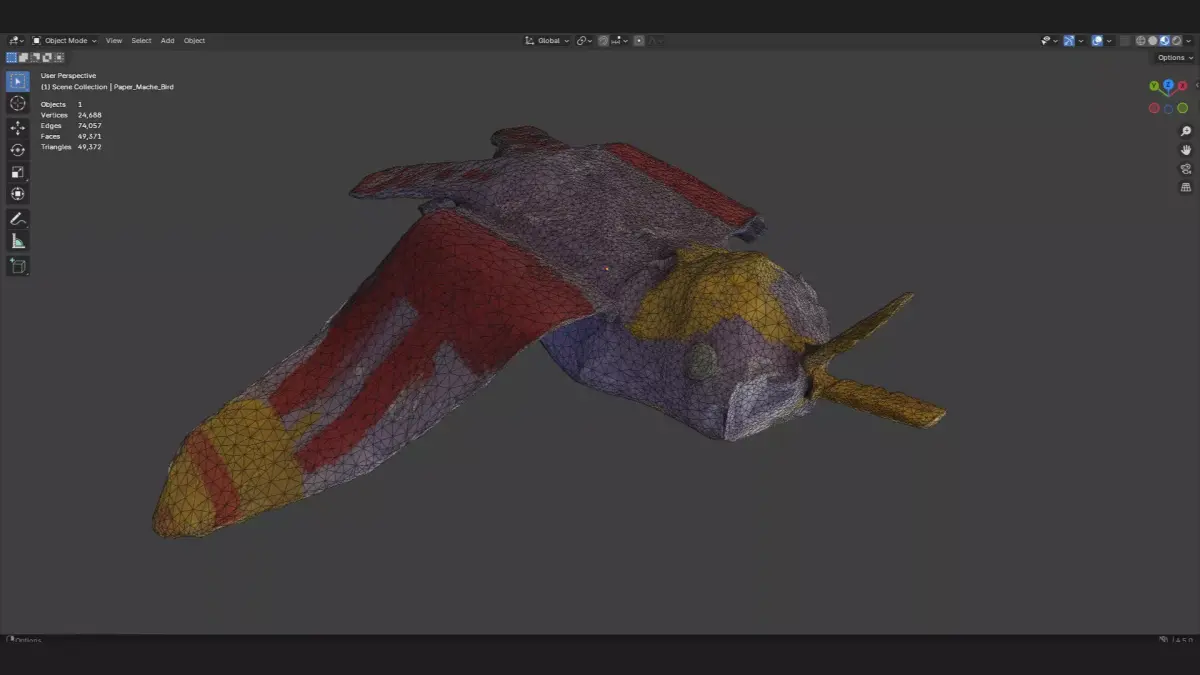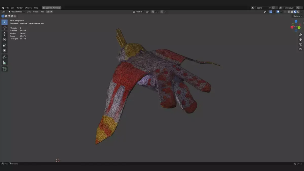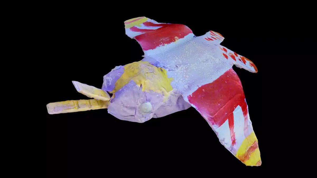 This is a photoreaslistic Paper mache kids art and craft project, a painted bird with vibrant colors. It was generated with photogrammetry 3d scanning and prepresents a actual childerens school project.use it as a mobile or decorative piece in renders
