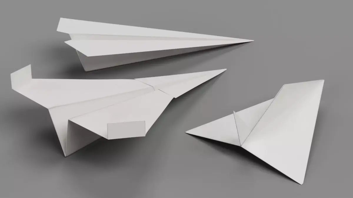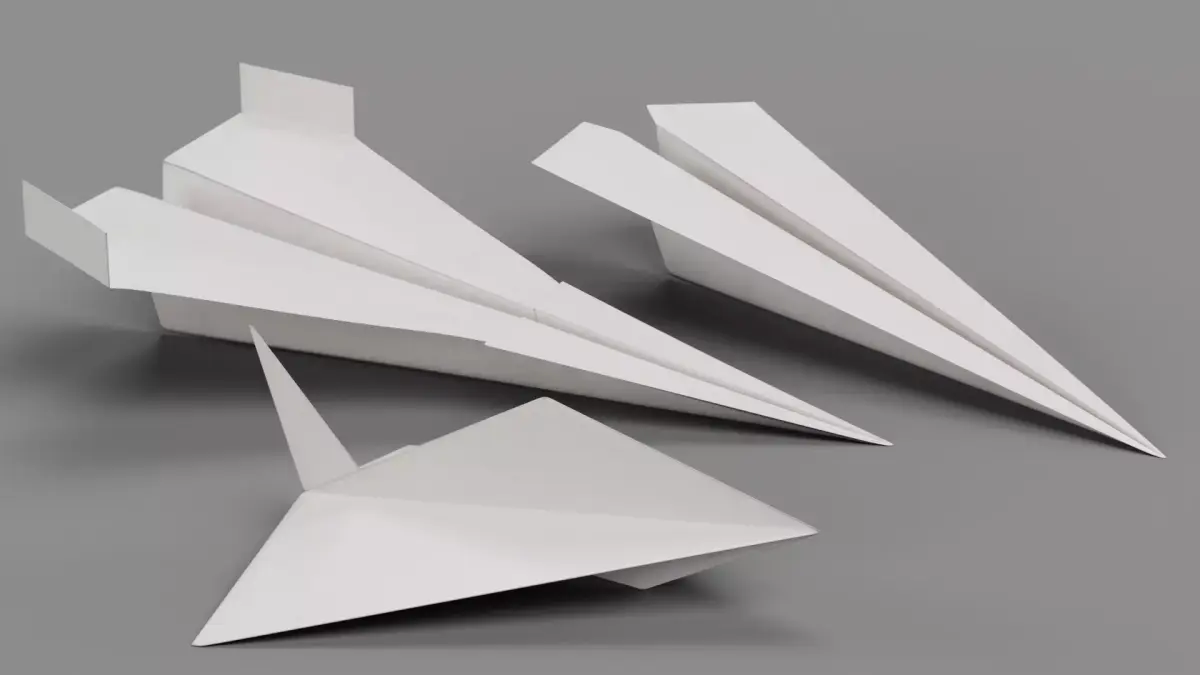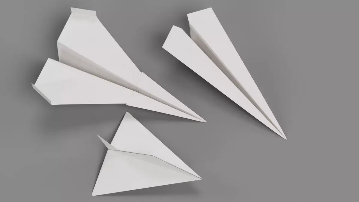 A stylized set of three white paper planes, capturing the folded paper geometry, edges, and subtle surface variations. The minimalistic design emphasizes the simplicity and delicate structure of real folded paper.