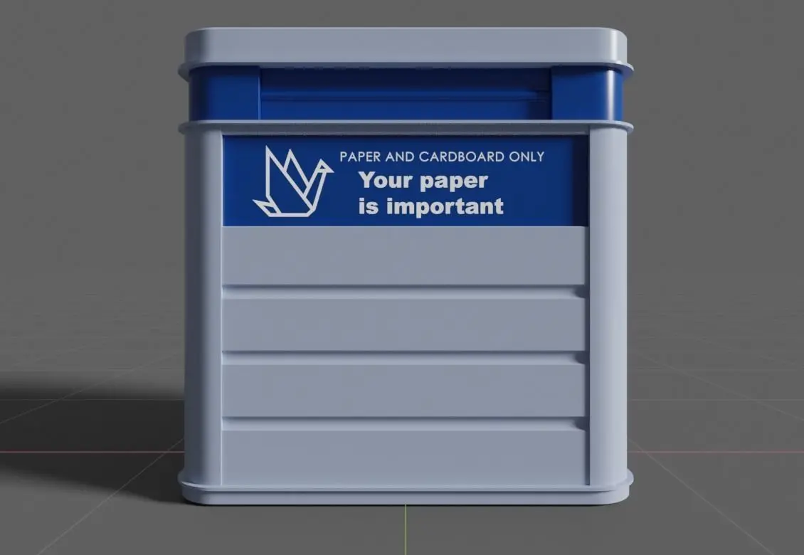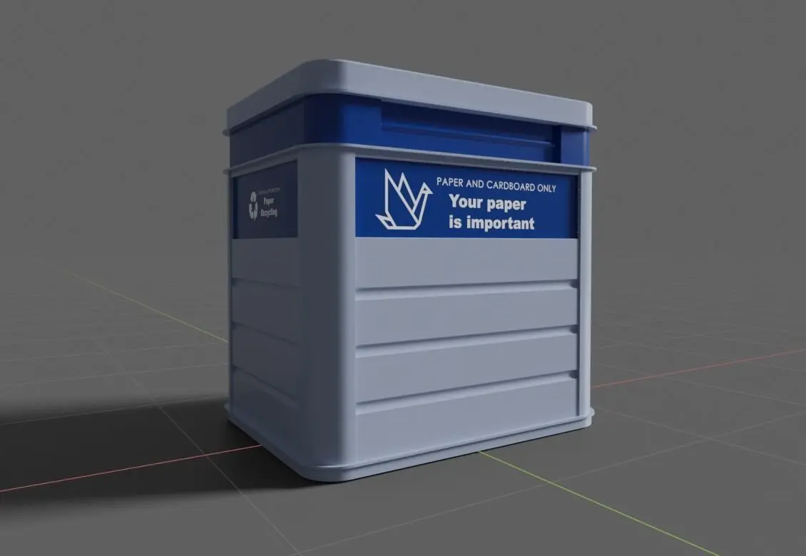 Paper recycling container 3D model. Made of metal in different panels and shapes full model, no bump maps. With folding hatches and top hooksMade in Blender 2.8 . Other formats available.Model wireframe ready for subdivisions. Quads.PBR materials.Textures available in 3 languages, png format. UV maps to match the faces of the container