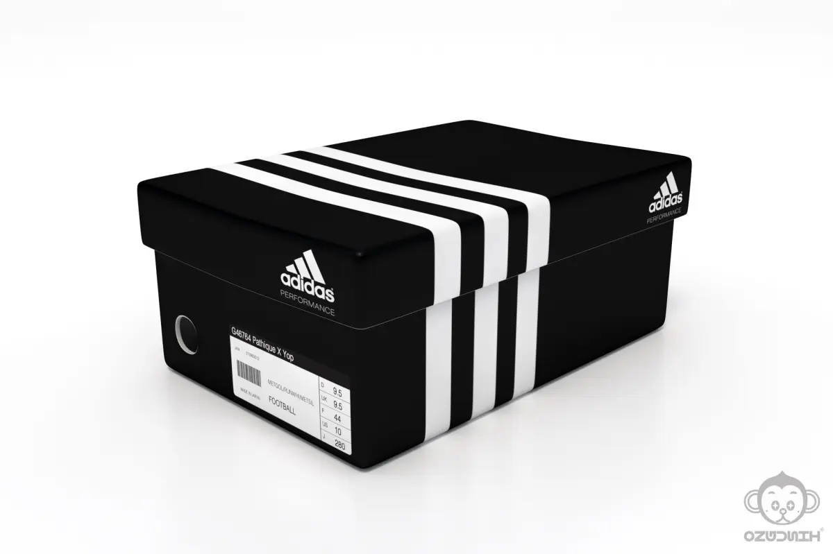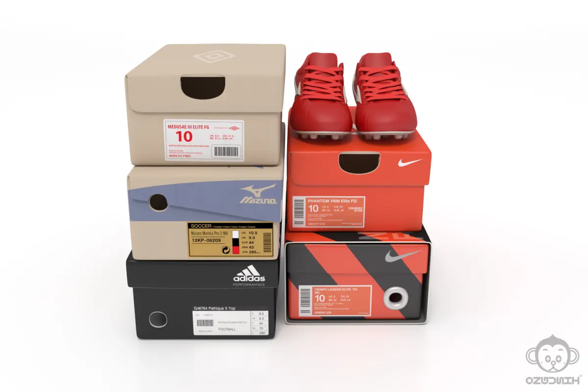 Branded paper shoe boxes package with red soccer football boot.(Nike Adidas Mizuno Umbro shoe box and Mizuno Classic football boot)