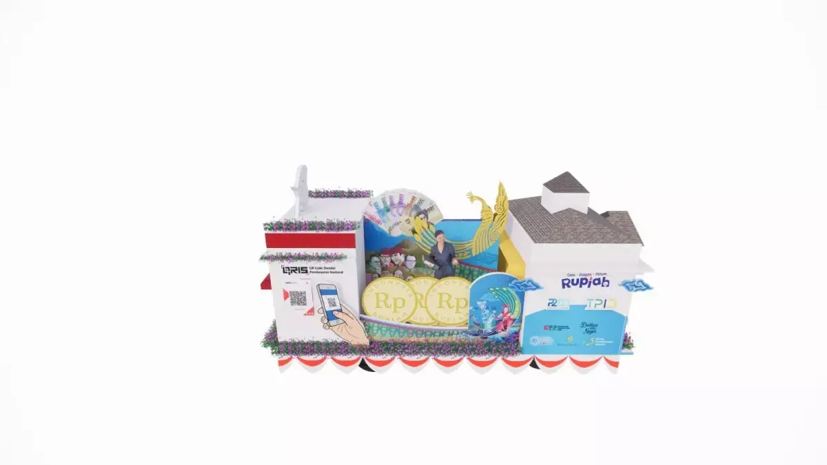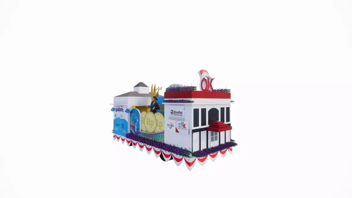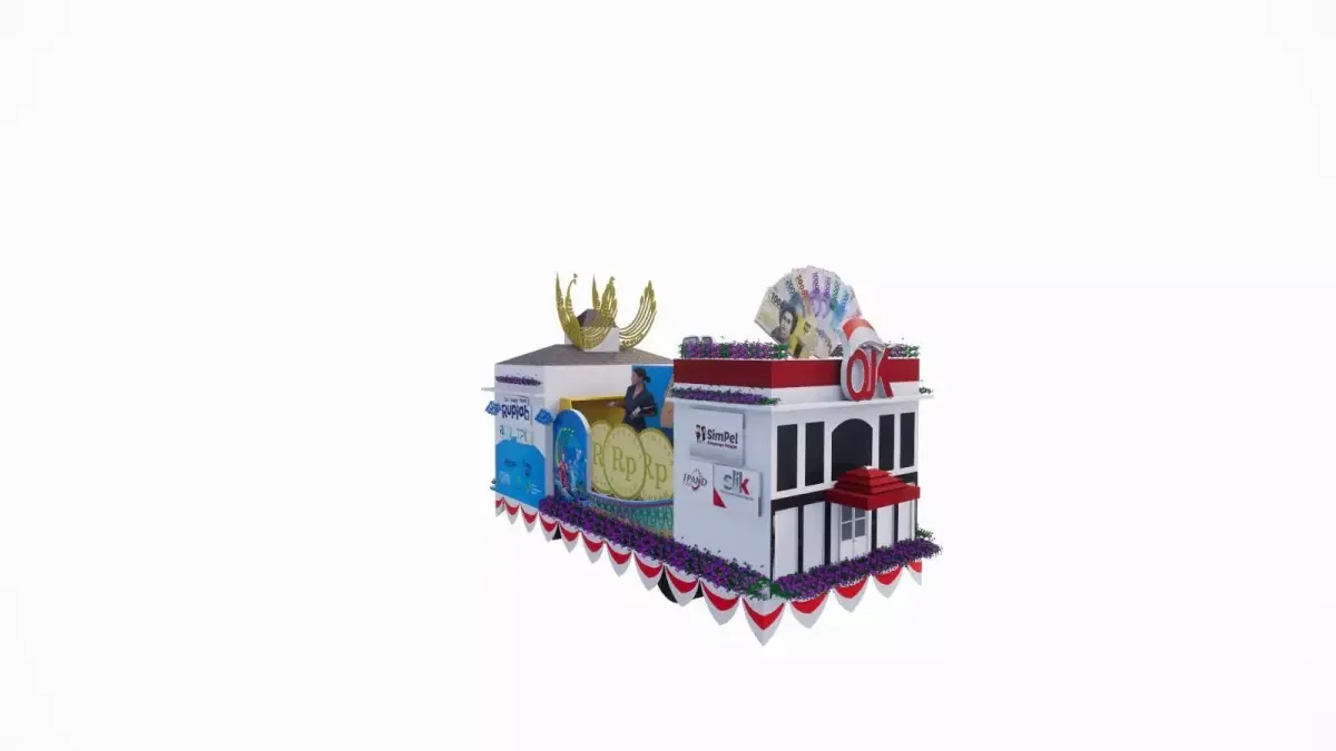 This is a detailed 3D model of a parade float car, designed with vibrant decorative elements including cultural ornaments, banners, and thematic props. The vehicle is covered with colorful decorations, making it suitable for:
