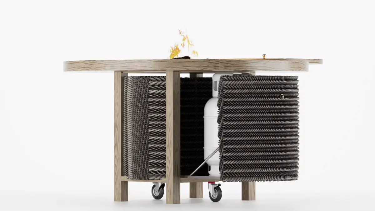 Key Features:2-in-1 Design: Easily transforms from a stylish dining/cocktail table (with a patterned wooden cover) to a captivating central fire pit with glowing embers/simulated coals.Premium Materials: Features a light-toned round wooden tabletop with a Herringbone pattern, and a base covered in a sophisticated, dark woven synthetic rattan for a sleek finish.Hidden Storage: Practical base with a removable panel designed to conceal a standard Propane (LPG) gas cylinder completely.Mobility: Equipped with durable caster wheels for easy relocation and placement on any outdoor surface.