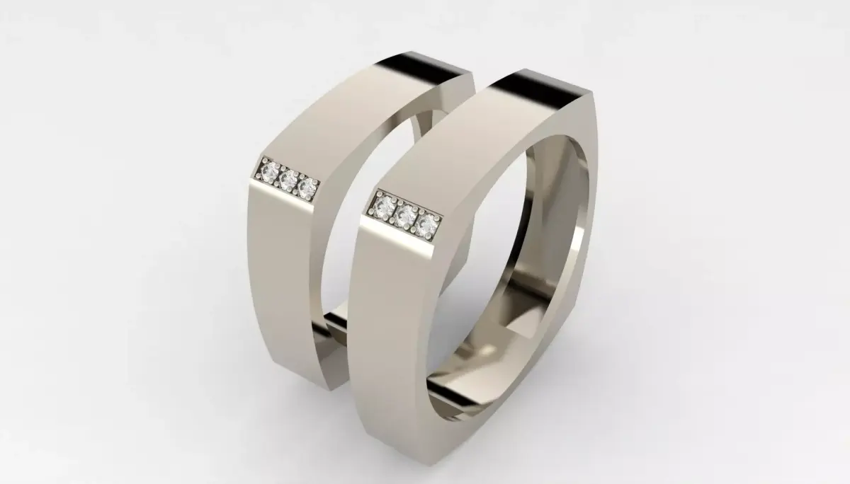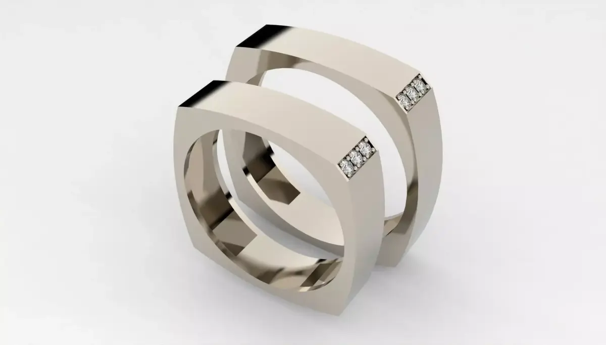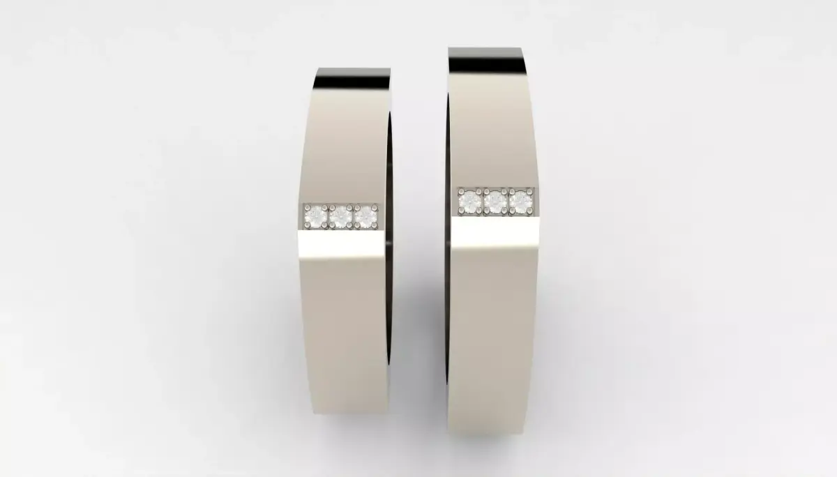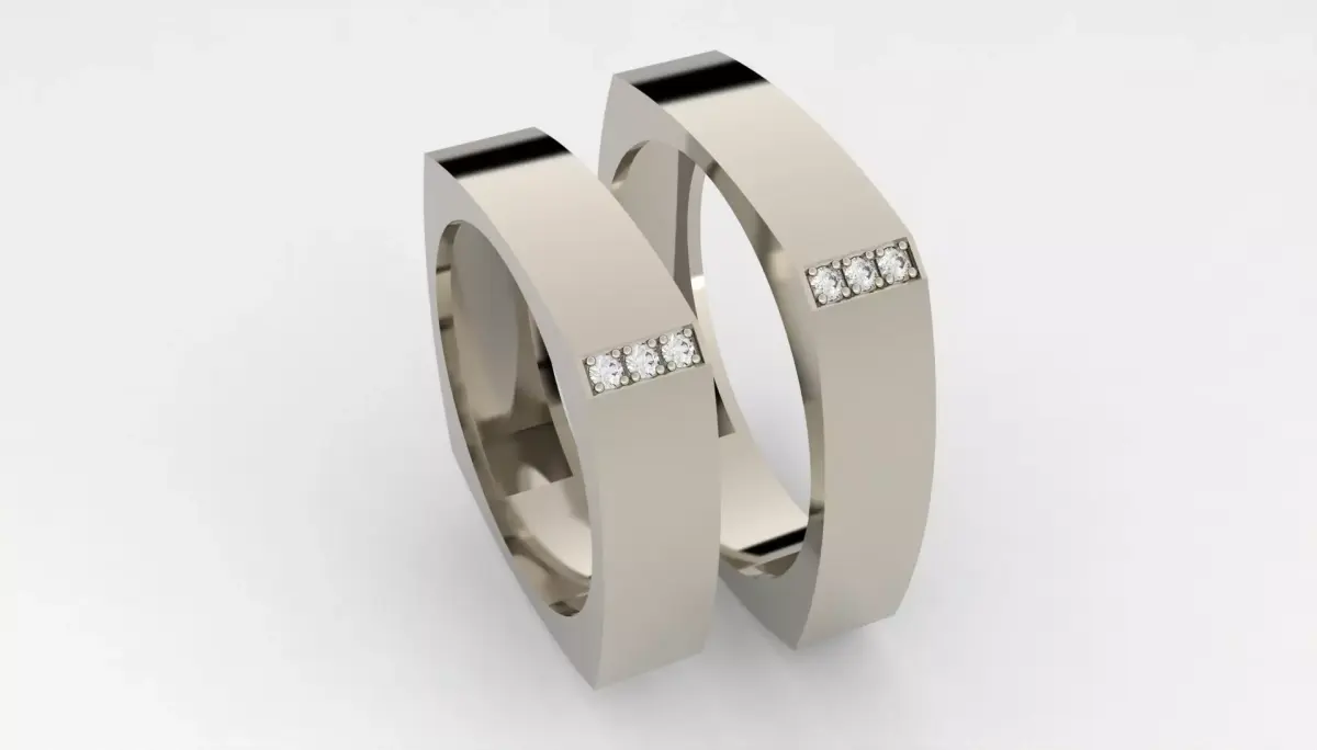 This contemporary wedding ring set redefines elegance through geometric precision and minimal design.Crafted in polished white gold, the squared band silhouette exudes strength and sophistication, symbolizing unity with modern sensibility.Each ring features a subtle cluster of diamonds, seamlessly set to reflect harmony between masculine structure and feminine grace.Perfect for photorealistic jewelry renders, animations, and product visualizations, this model delivers ultra-clean reflections, balanced proportions, and a luxury aesthetic ideal for fine jewelry showcases.A statement of timeless love shaped by modern artistry and precision craftsmanship.Men's Ring Size: 62 EuroWoman's Ring Size: 54 EuroFor any edit or revision: DM +447301387795 / +447350761213 or elpouriapaypal@gmail.com