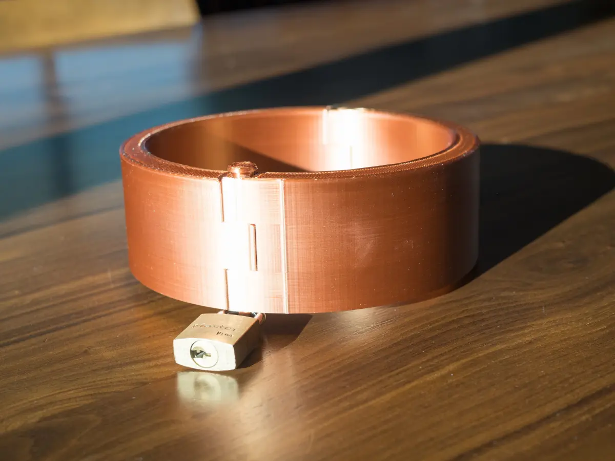 A large, functional and easy to print collar. The included zip has ten sets of .stl files, for neck circumferences from 11 to 19 (30-44cm). Simply measure the circumference of the wearer's neck and choose the next size up to print. The files will print easily on a bed at least 220 x 220mm. My example collar pictured was printed in copper silk PLA at the 13.5" size.