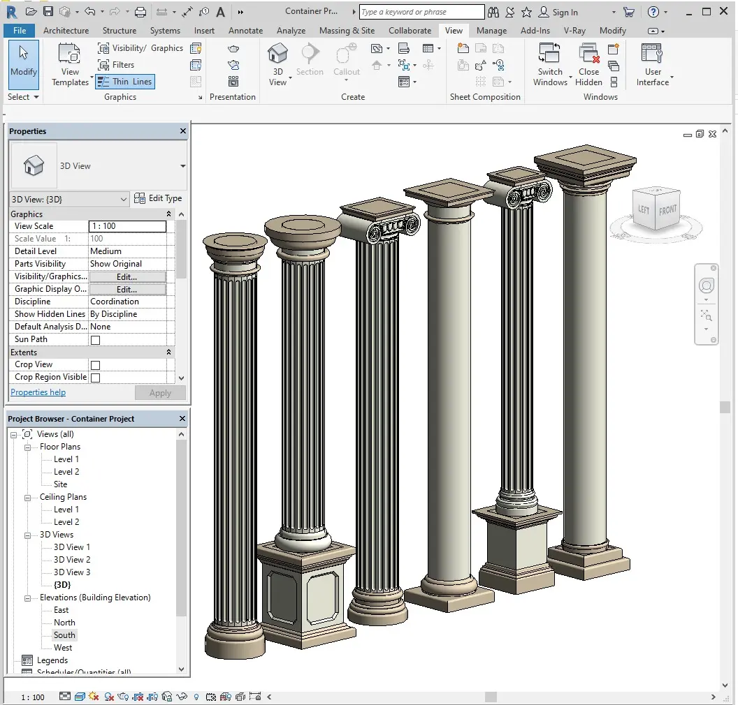 Elevate your designs with this versatile set of classic round columns. Featuring six unique designs, these columns are fully parametric, allowing you to adjust their height, capital, and base dimensions to suit your project needs. Materials can be customized, with separate material options for decorative elements, providing maximum design flexibility. Compatible with Revit 2018 and newer versions.