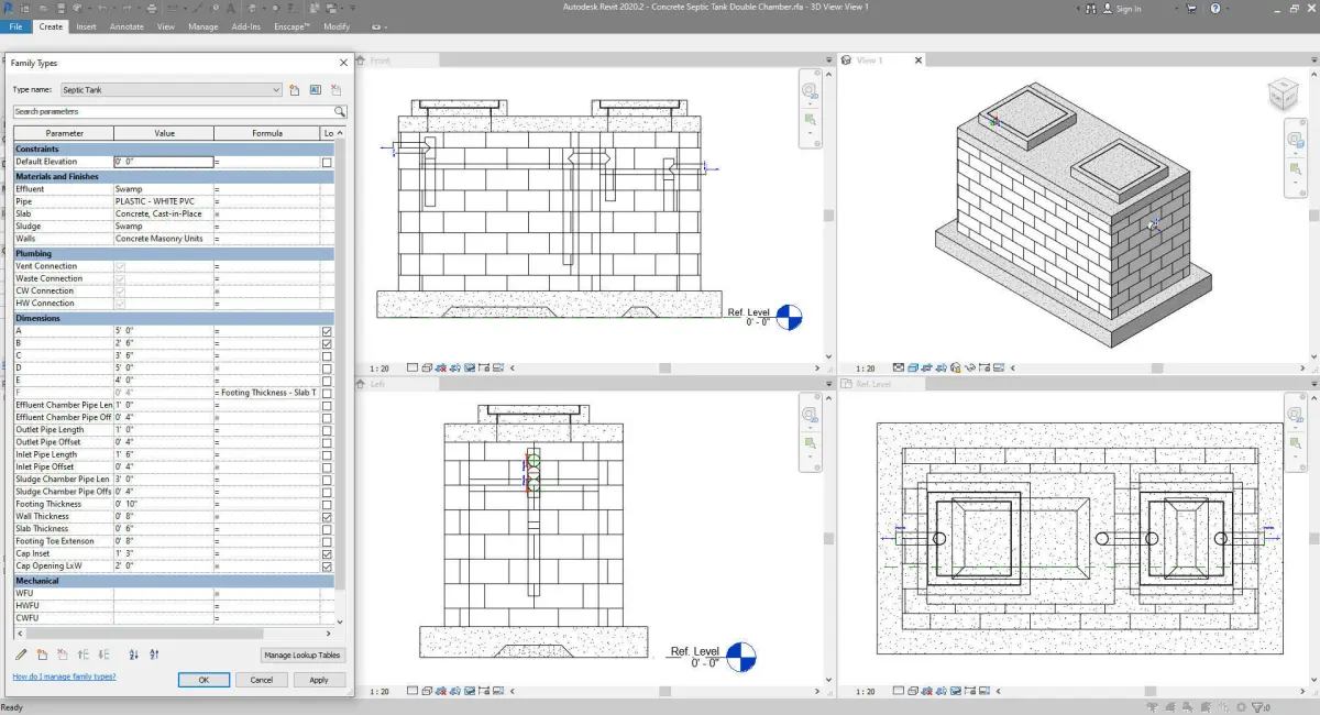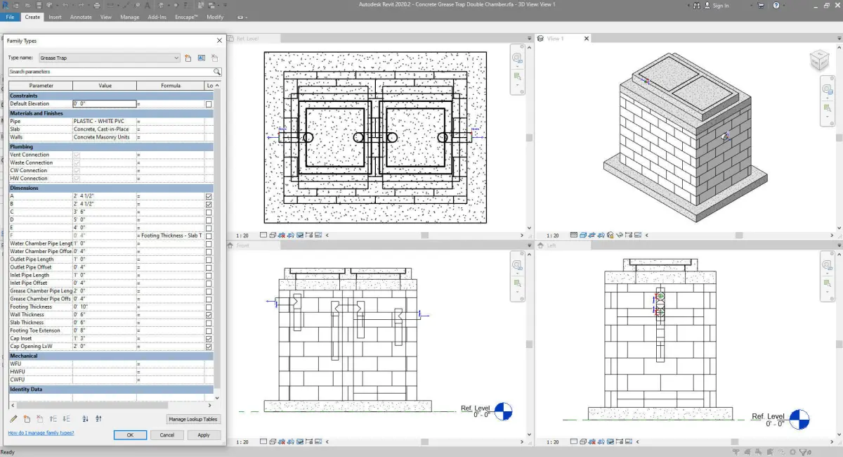 The Parametric Concrete Septic Tank Soak Pit and Grease Trap model were created in Autodesk Revit Family editor. Please the the product images for editable parameters values.