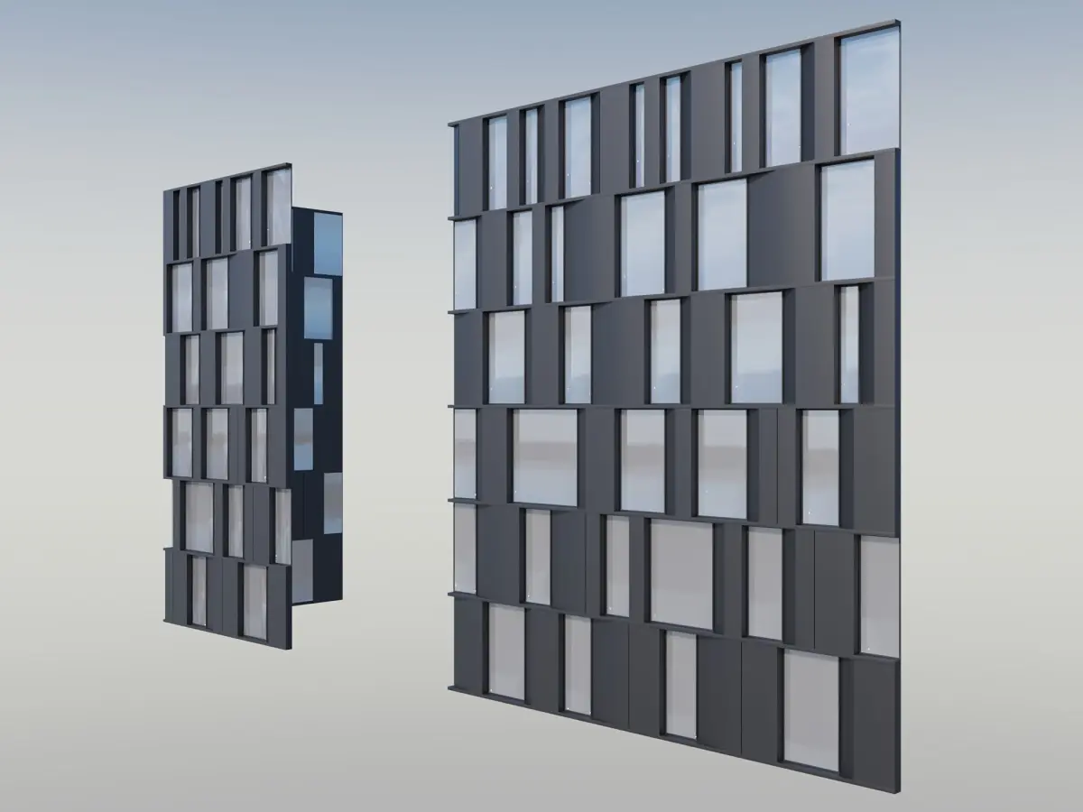 This is a high-quality 3D model of a parametric facade pattern for an office building, designed with a modern architectural concept. The pattern features perforated aluminum panels and glass modules, commonly used in contemporary office facades for both functional and aesthetic purposes.