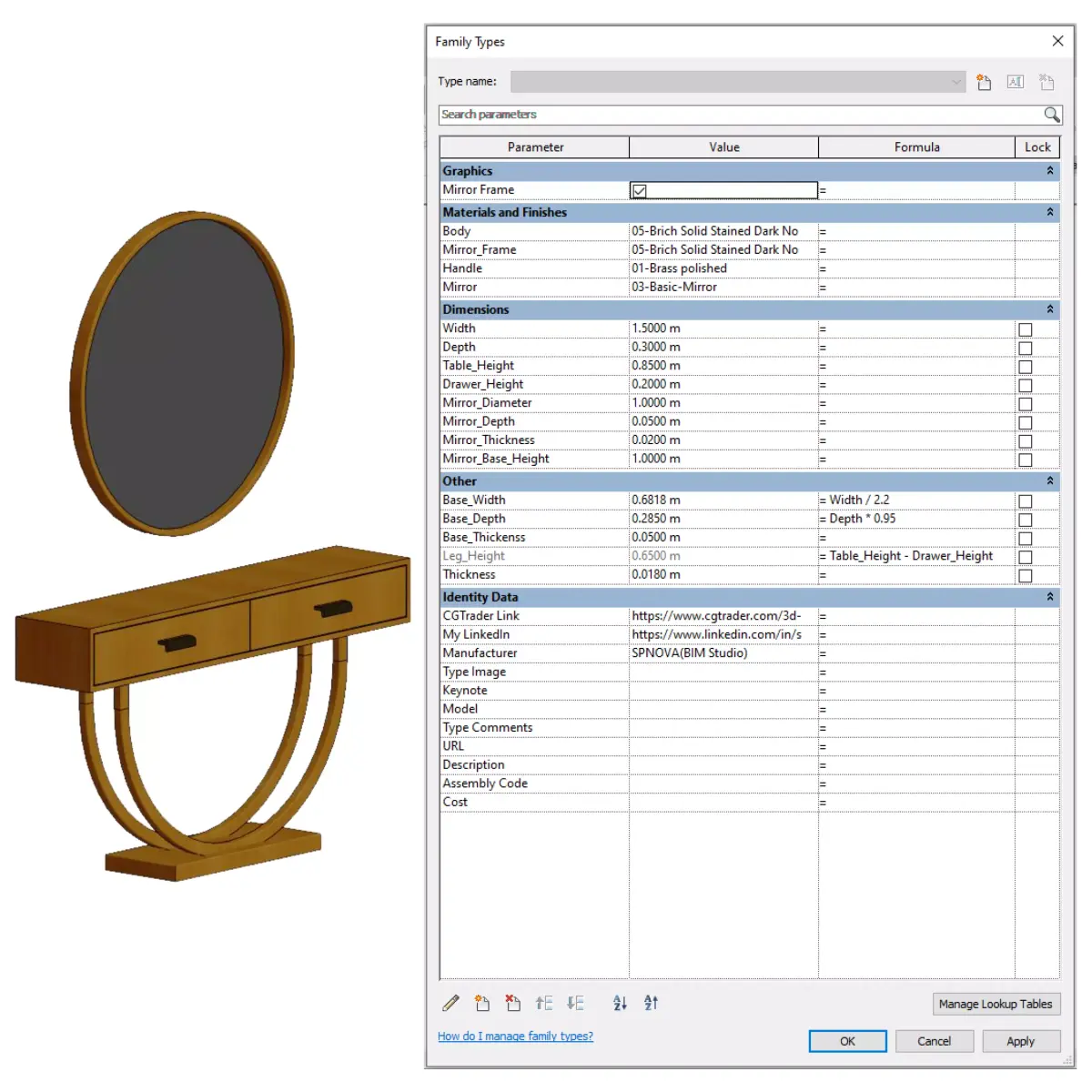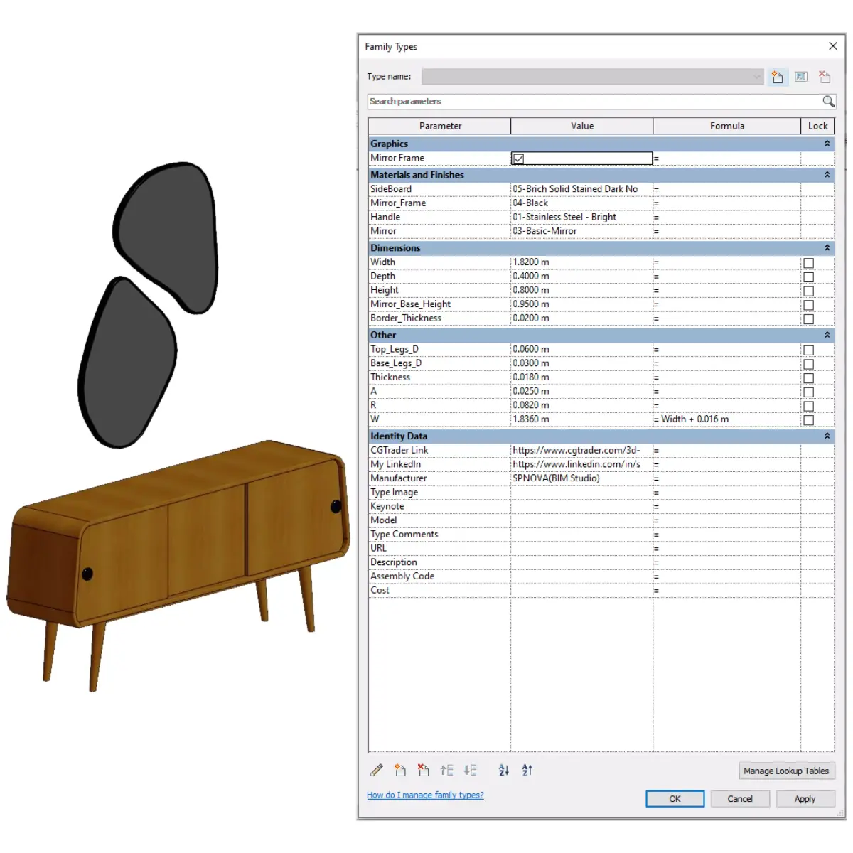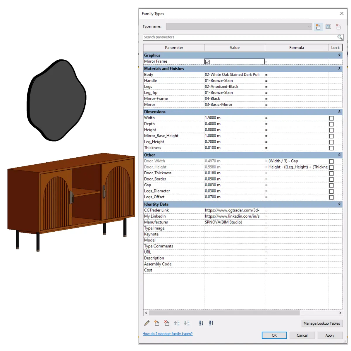 - Width, height, depth, mirror size, base height, leg height, door dimensions, and more— all adjustable through Revit parameters.