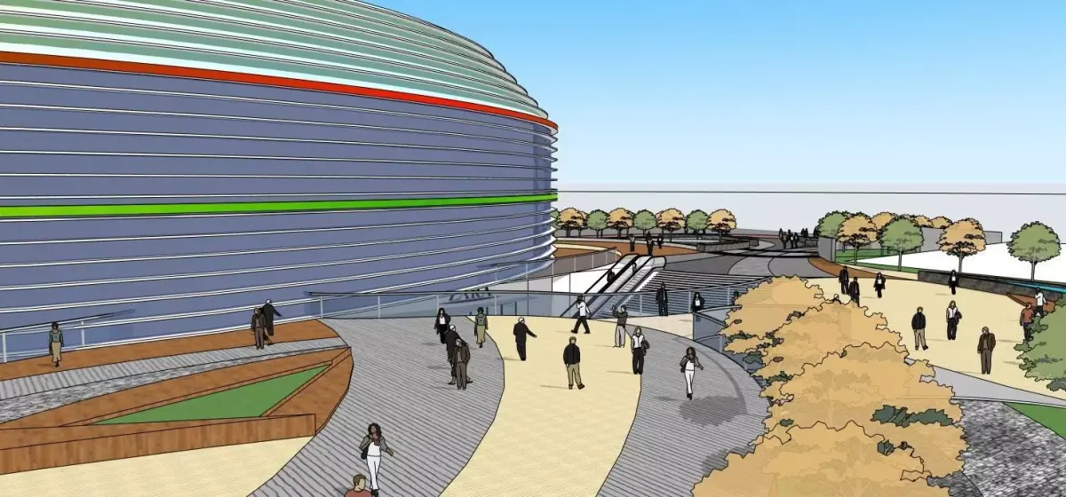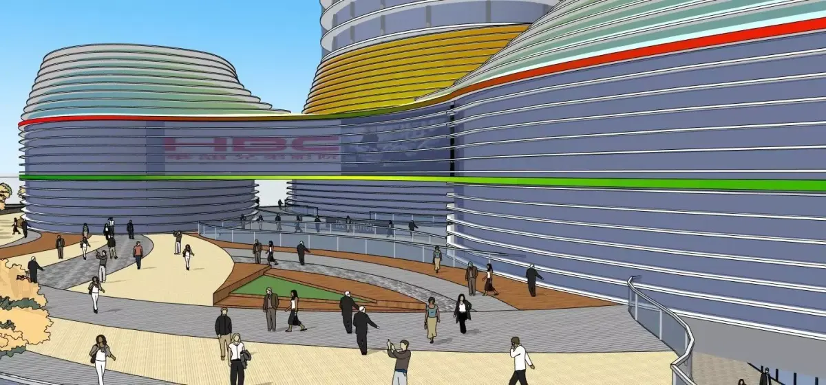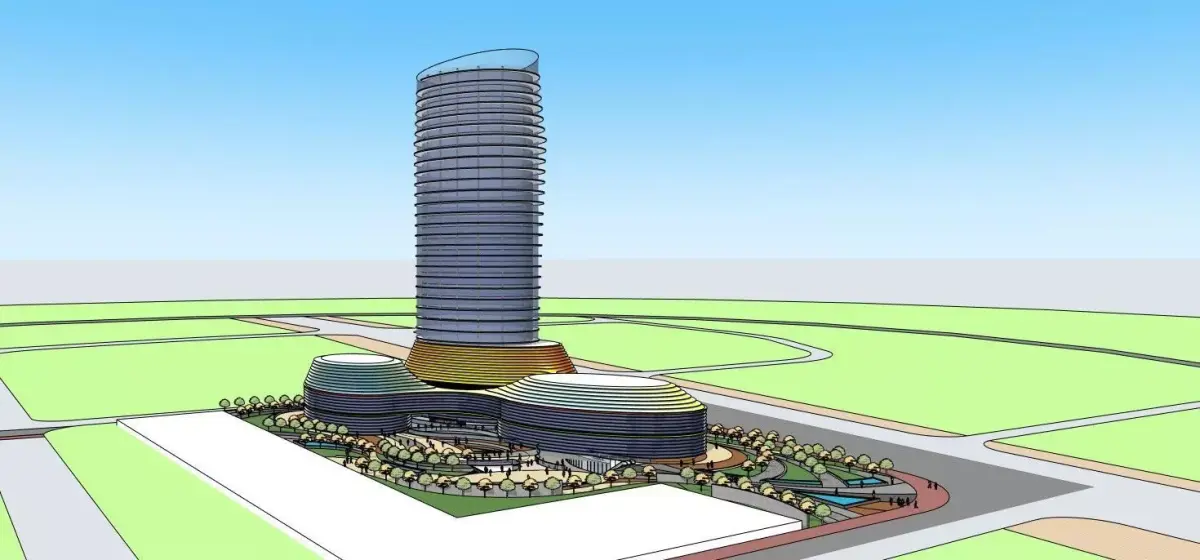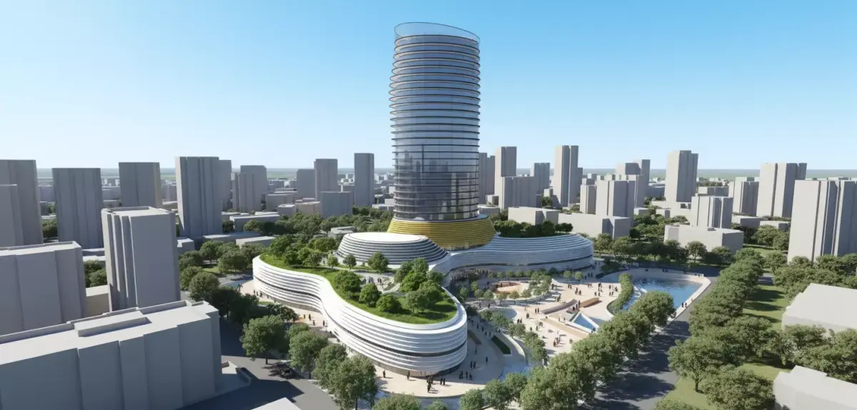 The design features a cylindrical glass tower rising from a three-wing flowing podium with terraces, greenery, pedestrian circulation, and water features — creating a strong architectural landmark suitable for both office tower and residential tower visualization.