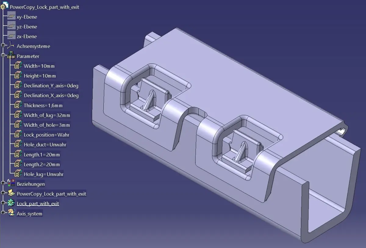 Parametrischer PowerCopy Parametrischer PowerCopy Lock_part_with_exit Scheinwerferfür Scheinwerfer und andre Produkte – 3D-CAD-ModellProduktbeschreibungDieser hochwertige, parametrische PowerCopy Parametrischer PowerCopy Lock_part_with_exit Scheinwerferist speziell für den Einsatz in Scheinwerferkonstruktionen und Fahrzeugbeleuchtungssystemen entwickelt. Er bietet eine passgenaue und wiederverwendbare Geometrie, die eine einfache Integration in verschiedene Beleuchtungssysteme ermöglicht. Dank des parametrischen Designs kann die Geometrie flexibel angepasst und in verschiedene Konstruktionen eingebunden werden.Hauptmerkmale• Parametrisches Design – Anpassbar an spezifische Anforderungen und verschiedene Fahrzeugmodelle• Optimiert für PowerCopy-Technologie – Wiederverwendbare Struktur für effiziente Konstruktion• Hohe Präzision – Perfekt für die industrielle Fertigung (Spritzguss, CNC, 3D-Druck)• Einfache Integration – Enthält alle relevanten Achsen, Ebenen und Referenzpunkte• Modular & wiederverwendbar – Ideal für verschiedene ScheinwerferprojekteTechnische Details• Kompatibilität: PowerCopy-Verriegelungskomponenten• Präzise Geometrie: Optimiert für exakte Montage• Referenzelemente: Enthält Achsen, Ebenen und Bezugspunkte• Ebenen & Schnitte: Für einfache Modifikationen und BearbeitungenVerfügbare Dateiformate• CATIA (.CATPart) – Auf Anfrage verfügbar• Weitere Formate – Auf AnfrageAnwendungsbereiche• Automobil-Scheinwerfer & Beleuchtungssysteme• Maschinenbau & Produktdesign• Prototypen- & SerienfertigungVorteile• Effiziente Konstruktion – Spart Zeit und Entwicklungskosten• Höchste Qualität – Perfekt für professionelle Anwendungen• Flexibel einsetzbar – Für verschiedene Beleuchtungssysteme geeignetJetzt herunterladen und Ihre Konstruktion optimieren!