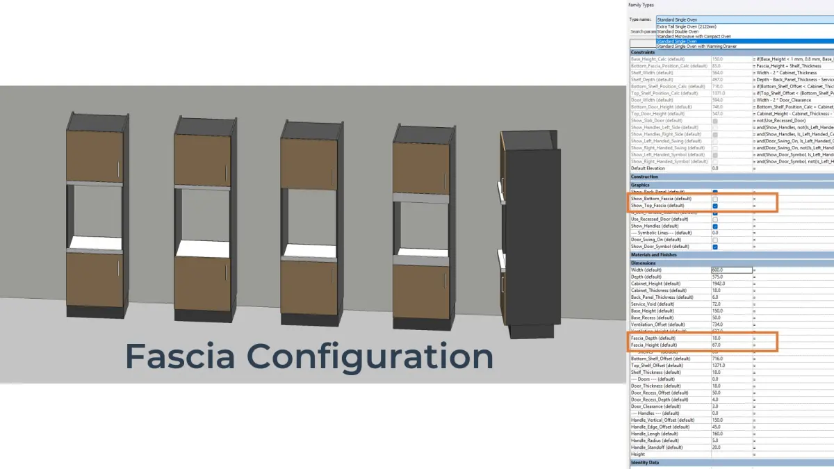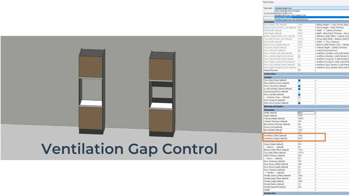 - Adjust cabinet frame dimensions: width, height, depth, base height and recess, service void, fascia rail, and ventilation gap to fit your layout