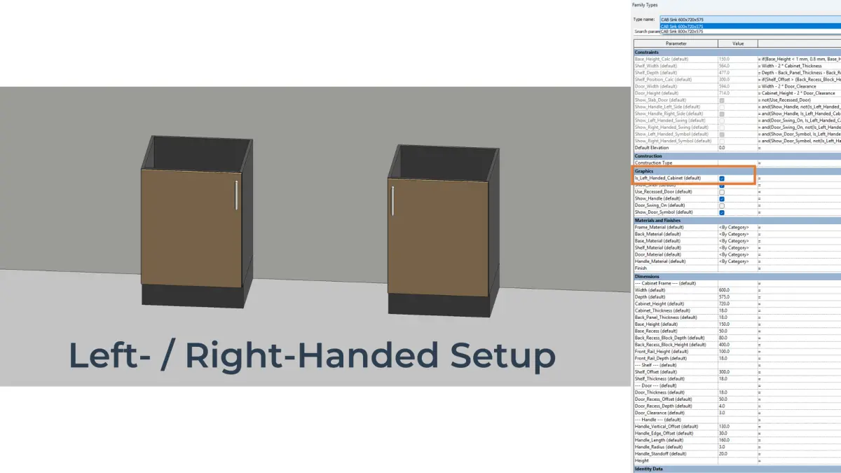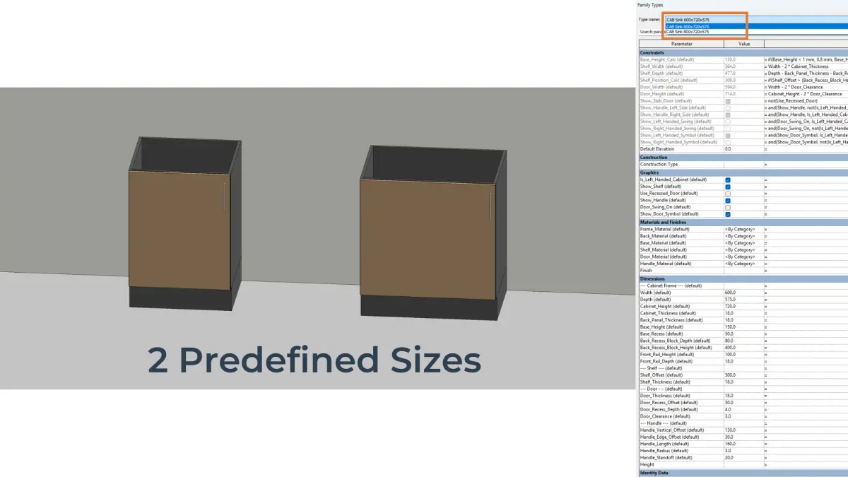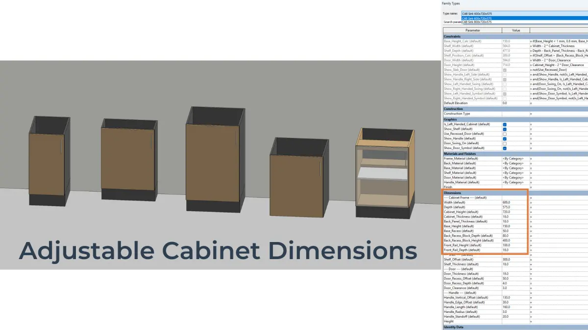 This fully parametric Revit family lets you create an adjustable sink base cabinet with a customisable shelf, one door, an optional handle, and full material control. Designed for kitchen, office, or storage spaces, it adapts easily to different dimensions and design needs.