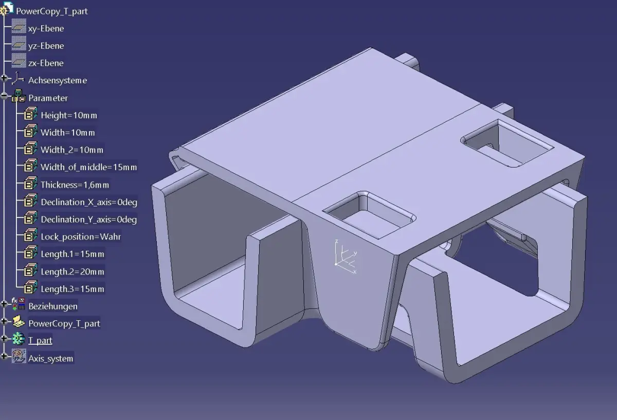 Parametrischer T Part für Scheinwerfer und andre Produkte – 3D-CAD-ModellProduktbeschreibungDieser hochwertige, parametrische T Part ist speziell für den Einsatz in Scheinwerferkonstruktionen und Fahrzeugbeleuchtungssystemen entwickelt. Er bietet eine passgenaue und wiederverwendbare Geometrie, die eine einfache Integration in verschiedene Beleuchtungssysteme ermöglicht. Dank des parametrischen Designs kann die Geometrie flexibel angepasst und in verschiedene Konstruktionen eingebunden werden.Hauptmerkmale• Parametrisches Design – Anpassbar an spezifische Anforderungen und verschiedene Fahrzeugmodelle• Optimiert für PowerCopy-Technologie – Wiederverwendbare Struktur für effiziente Konstruktion• Hohe Präzision – Perfekt für die industrielle Fertigung (Spritzguss, CNC, 3D-Druck)• Einfache Integration – Enthält alle relevanten Achsen, Ebenen und Referenzpunkte• Modular & wiederverwendbar – Ideal für verschiedene ScheinwerferprojekteTechnische Details• Kompatibilität: T-förmige Bauteile für Scheinwerferkonstruktionen• Präzise Geometrie: Optimiert für exakte Montage• Referenzelemente: Enthält Achsen, Ebenen und Bezugspunkte• Ebenen & Schnitte: Für einfache Modifikationen und BearbeitungenVerfügbare Dateiformate• CATIA (.CATPart) – Auf Anfrage verfügbar• Weitere Formate – Auf AnfrageAnwendungsbereiche• Automobil-Scheinwerfer & Beleuchtungssysteme• Maschinenbau & Produktdesign• Prototypen- & SerienfertigungVorteile• Effiziente Konstruktion – Spart Zeit und Entwicklungskosten• Höchste Qualität – Perfekt für professionelle Anwendungen• Flexibel einsetzbar – Für verschiedene Beleuchtungssysteme geeignetJetzt herunterladen und Ihre Konstruktion optimieren!