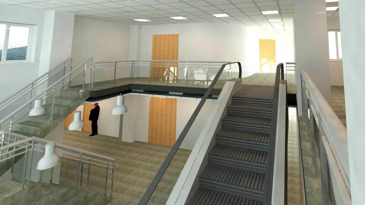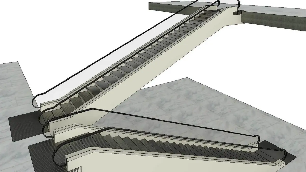 The escalator has a glass balustrade with a handrail parametric material on top. Mechanism pits are included with the design together with a cut option to cut the slab that it is supported on.