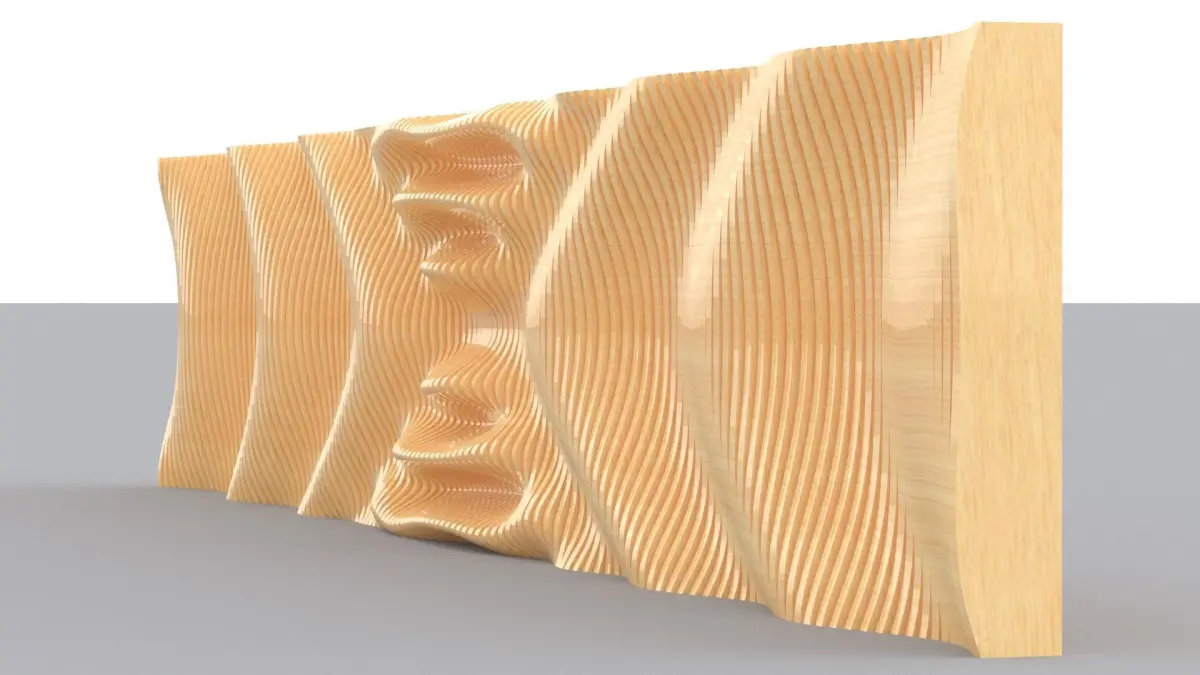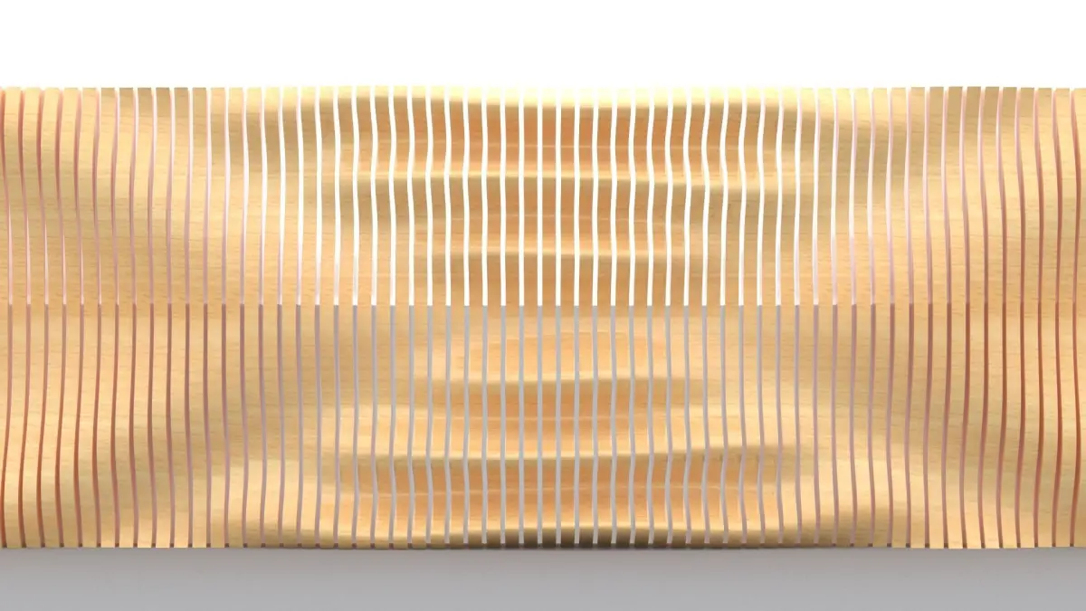 A Sliced Wooden Wavy Wall, with Parallel longitudinal Curves used to define the final form, the wall could be used as an interior decoration object, the model is suitable for Indoor and Outdoor architectural and artistic projects, with a modern style and science fiction vibes that will add uniqueness to any project.
