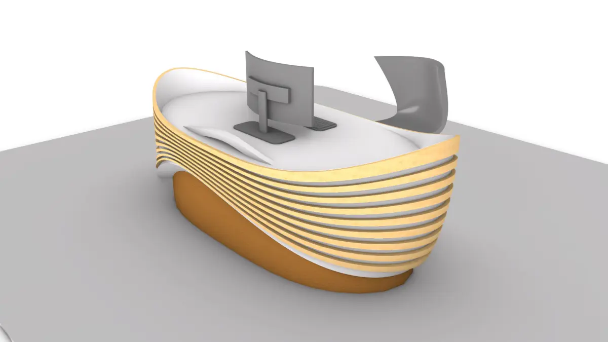 An Indoor wooden Reception Desk with a Parametric Wavy SciFi design with wooden smooth skinny beams waves-like and a central desk block with a fluid form, it was made for Decorative purposes and a practical furniture object, the model was created using computational parametric tools to achieve the most accurate geometry with clean details, it could be used for architectural render purposes Indoors, the desk could be used in modern design architectural contexts in commercial, offices or business spaces.