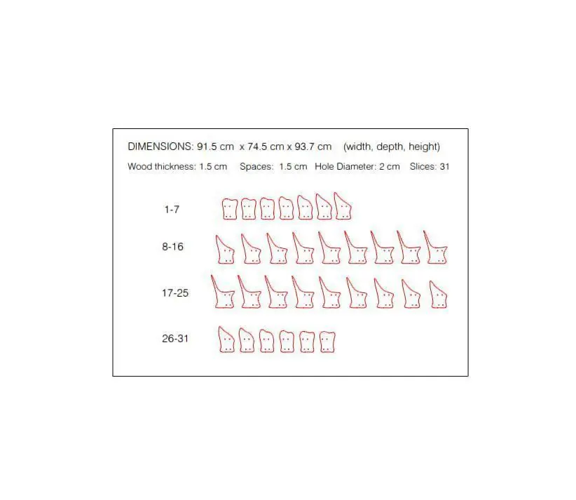 Dimensions: 937 x 91.5 x 745 mm (height - length - depth) (Wood thickness: 1.5 cm Spaces: 1.5 cm Hole diameter: 2 cm)