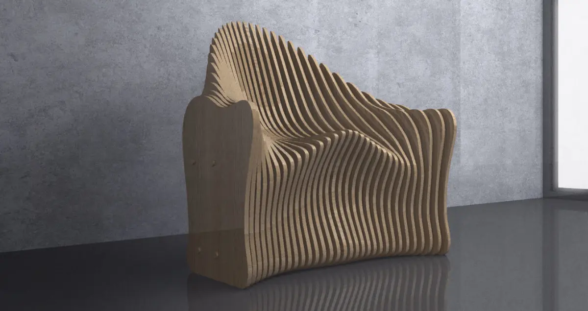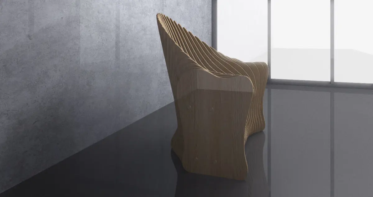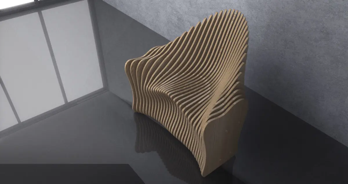 This is a parametric armchair which can be used in interior places, such as offices and houses. Parametric design on wood panels.