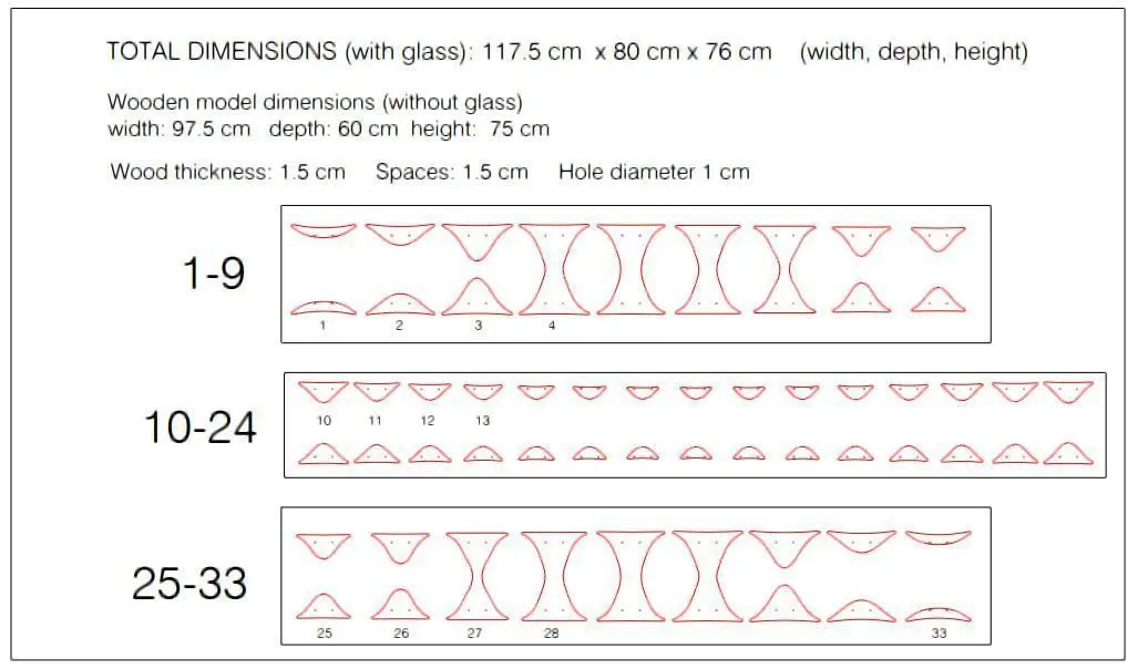 Wooden bottom model dimensions: 97.5 cm x 60 cm x 75 cm (width, depth, height)Thickness: 15 mmSpaces: 15 mmHole diameter: 10 mmSlices: 33