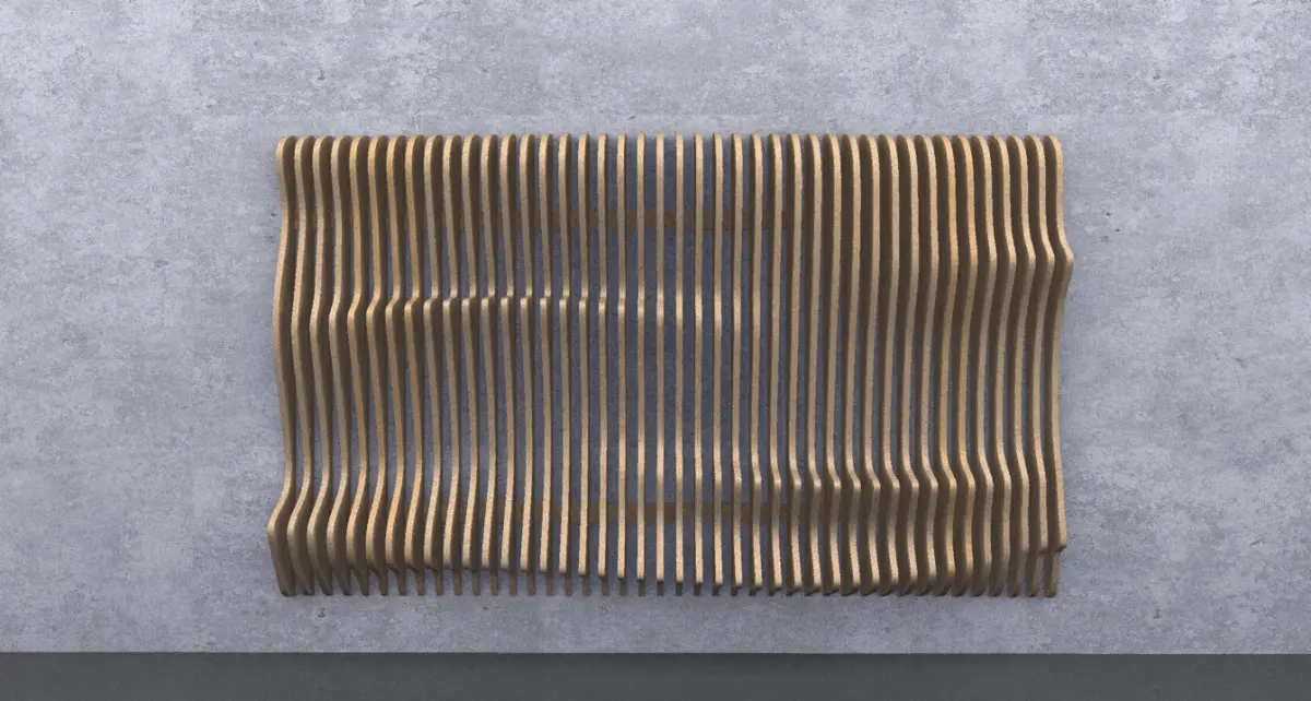 Parametric wavy wooden panels can be used in interior places. Parametric design on wood panels. There are notches on backside of panels to assembly. You can download both 3D model files and 2D cutting files.