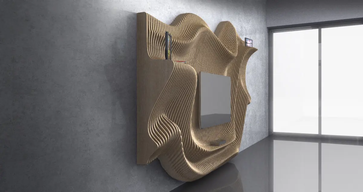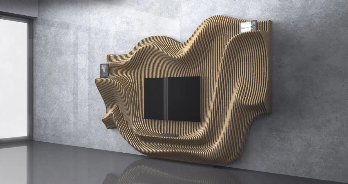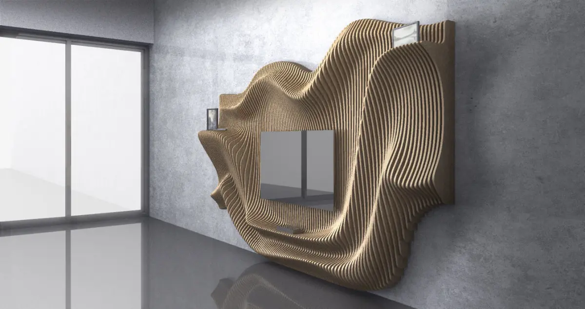 Parametric wavy wooden panels which look like waves can be used in livingrooms. There are notches on backside of panels to assembly and it is ready for cut!
